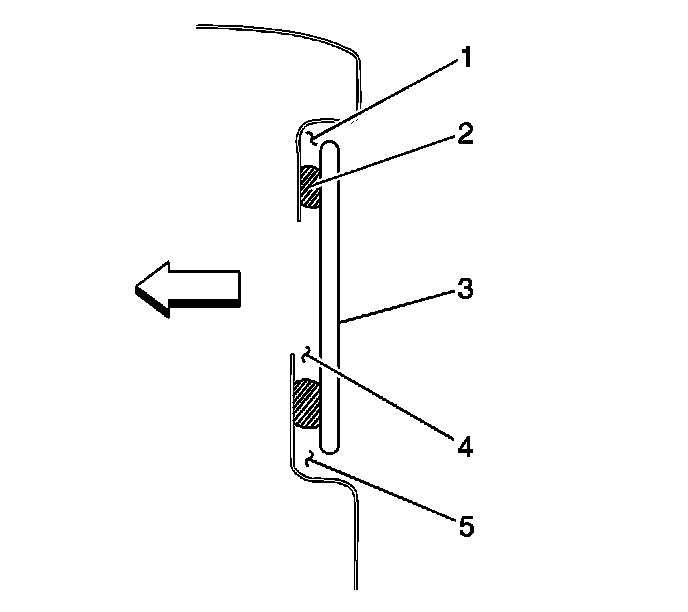 7. Use body color paint and apply to any scratches exterior (1, 5) of the urethane adhesive bead (2).