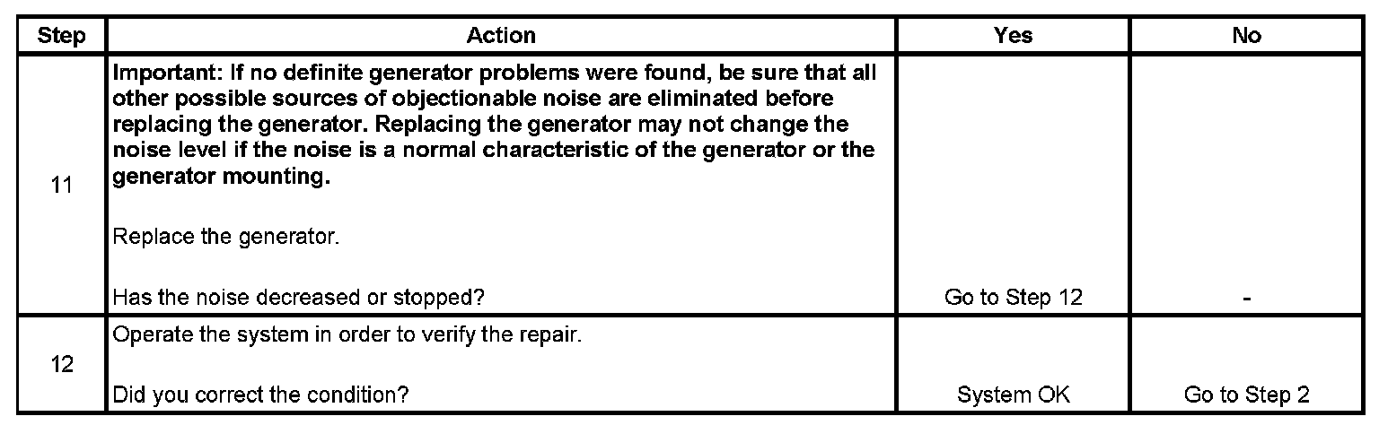 Noise from a generator may be due to electrical or mechanical noise. Electrical noise, magnetic whine, usually varies with the electrical load placed on the generator and is a normal operating characteristic of all generators. When diagnosing a noisy generator, it is important to remember that loose or misaligned components around the generator may transmit the noise into the passenger compartment and that replacing the generator may not solve the problem.