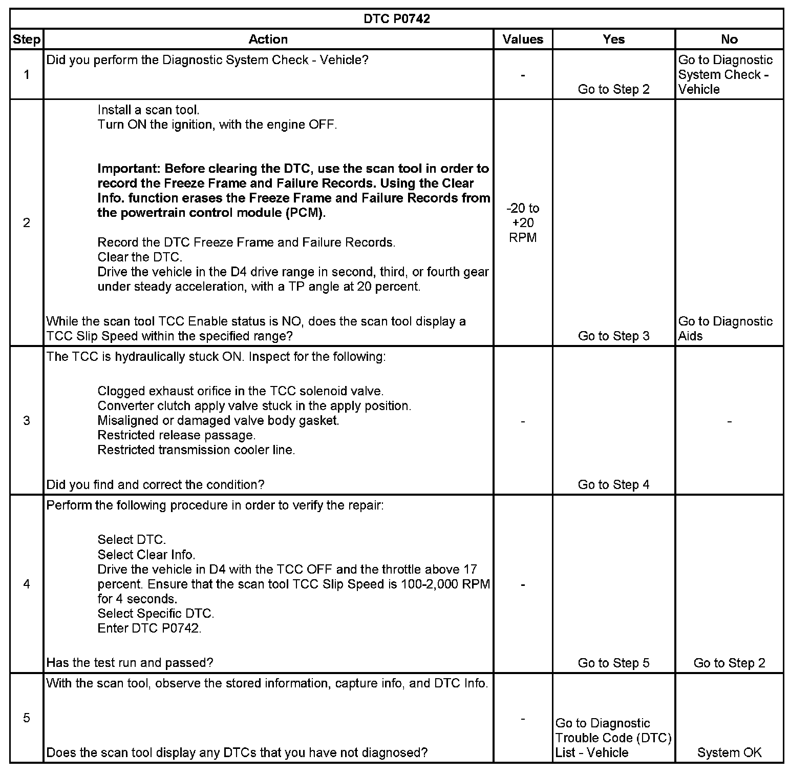 When the PCM detects low TCC slip when the TCC is commanded OFF, then DTC P0742 sets. DTC P0742 is a type B DTC.