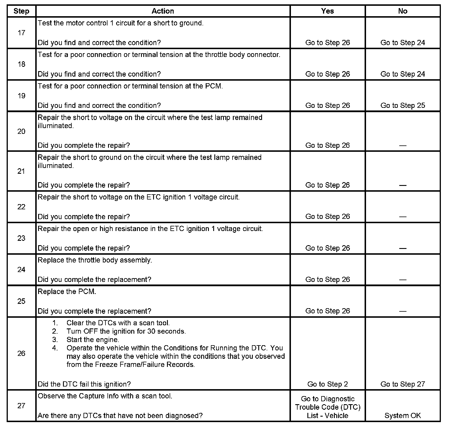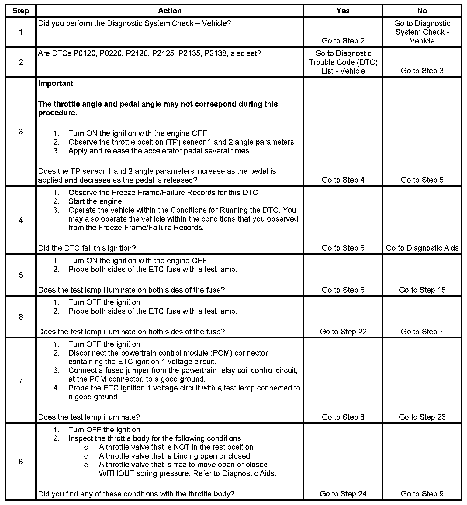 The commanded throttle position (TP) is compared to the actual TP based on accelerator pedal position (APP) and possibly other limiting factors. Both values should be within a calibrated range of each other. The powertrain control module (PCM) continuously monitors the commanded and actual throttle positions. This DTC sets if the values are greater than the calibrated range.