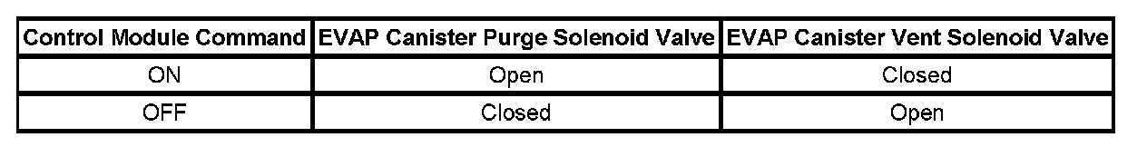 The following table illustrates the relationship between the ON and OFF states, and the OPEN or CLOSED states of the EVAP canister purge and vent solenoid valves.