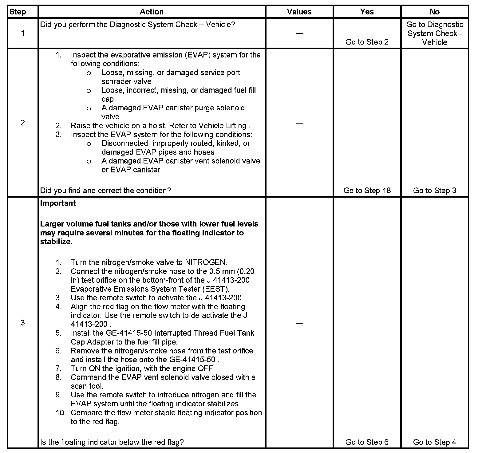 The numbers below refer to the step numbers on the diagnostic table.