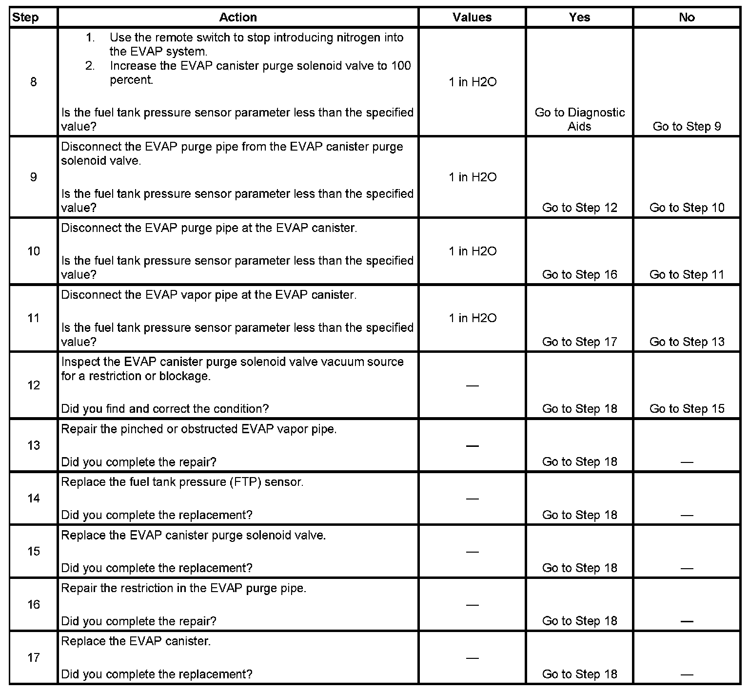 The control module tests the evaporative emission (EVAP) system for a large leak. The control module monitors the fuel tank pressure (FTP) sensor signal to determine the EVAP system vacuum level. When the conditions for running are met, the control module commands the EVAP canister purge solenoid valve OPEN and the EVAP canister vent solenoid valve CLOSED. This allows engine vacuum to enter the EVAP system. At a calibrated time, or vacuum level, the control module commands the EVAP canister purge solenoid valve closed, sealing the system, and monitors the FTP sensor input in order to determine the EVAP system vacuum level. If the system is unable to achieve the calibrated vacuum level, or the vacuum level decreases too rapidly, this DTC sets.