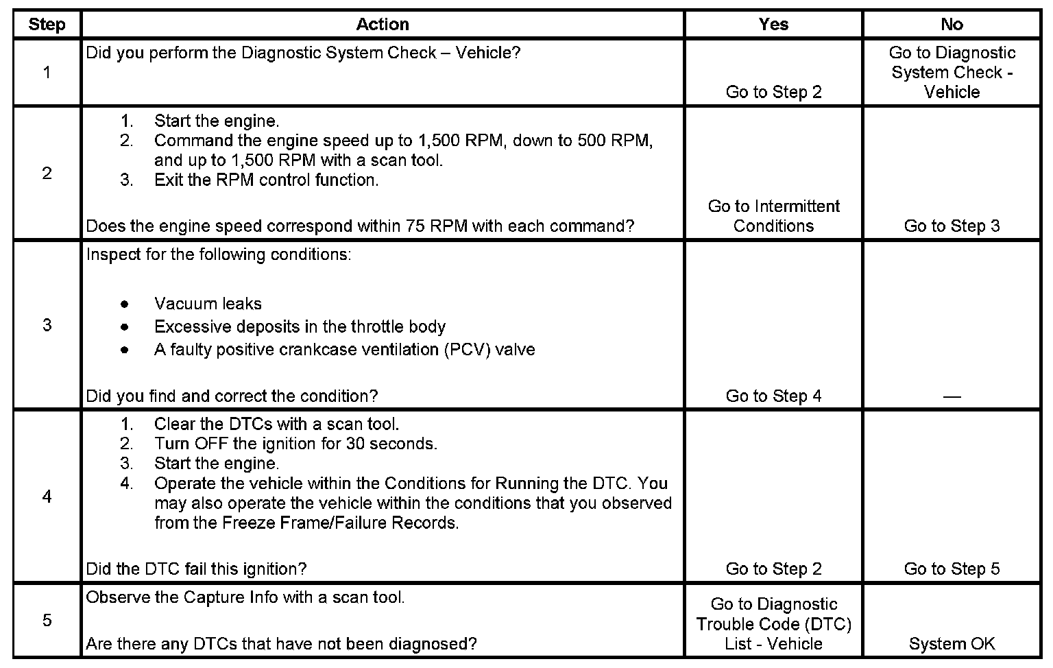 The throttle actuator control (TAC) motor is controlled by the powertrain control module (PCM). The DC motor located in the throttle body drives the throttle plate. In order to decrease idle speed, the PCM commands the throttle closed reducing air flow into the engine and the idle speed decreases. In order to increase idle speed, the PCM commands the throttle plate open allowing more air to pass the throttle plate. If the actual idle RPM does not match the desired idle RPM within a calibrated time, this DTC sets.