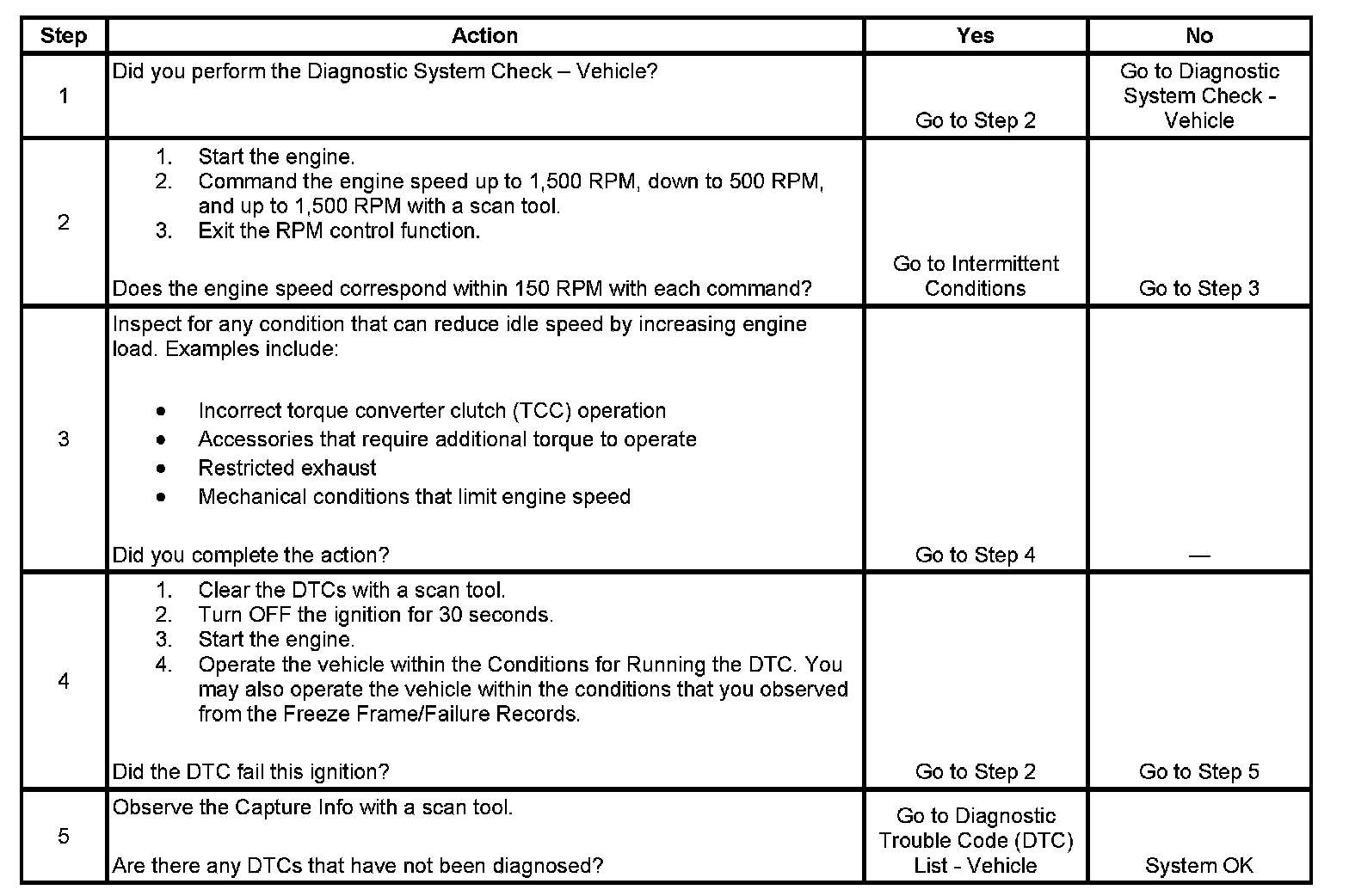 The throttle actuator control (TAC) motor is controlled by the powertrain control module (PCM). The DC motor located in the throttle body drives the throttle plate. In order to decrease idle speed, the PCM commands the throttle closed reducing air flow into the engine and the idle speed decreases. In order to increase idle speed, the PCM commands the throttle plate open allowing more air to pass the throttle plate. If the actual idle RPM does not match the desired idle RPM within a calibrated time, this DTC sets.