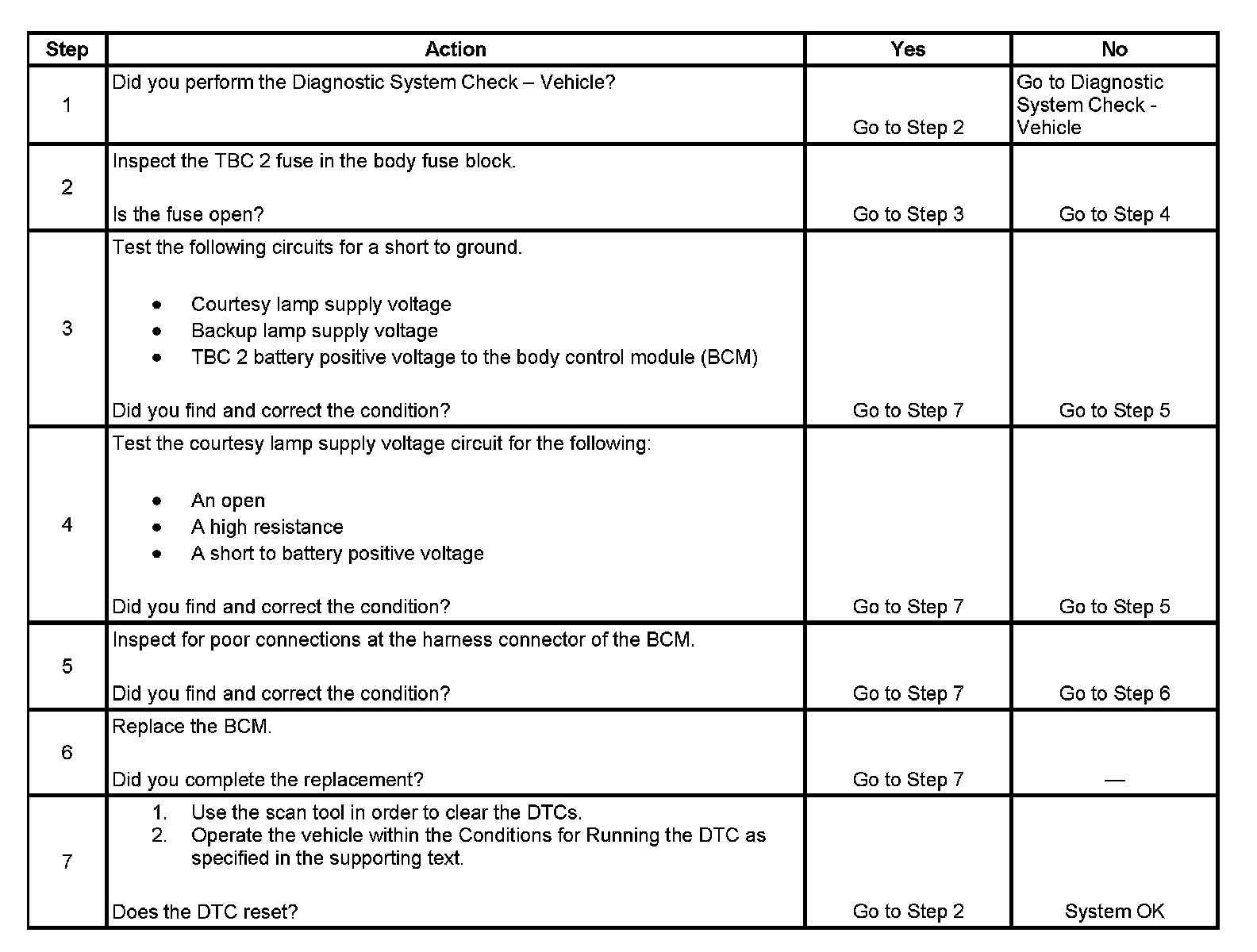 - When the BCM is not receiving a courtesy lamp illumination request signal and the courtesy lamp supply voltage circuit is open before the first connection after the BCM or shorted to voltage