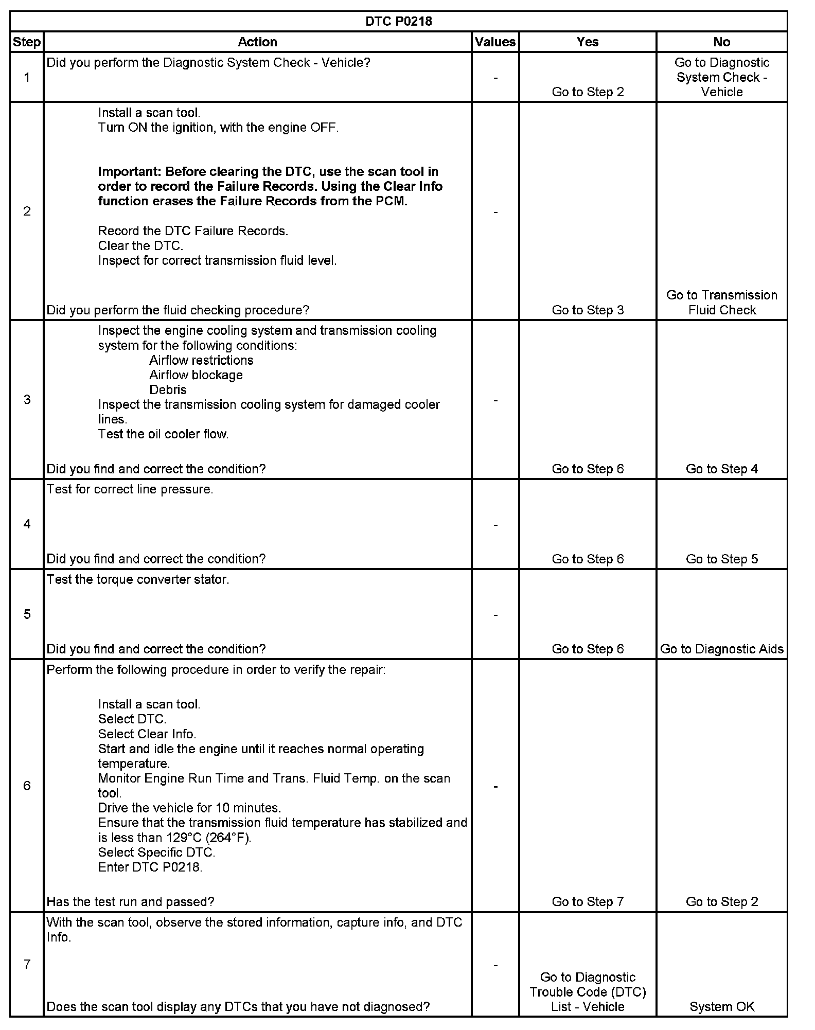 When the powertrain control module (PCM) detects a high transmission fluid temperature (TFT) for a long period of time, then DTC P0218 sets. DTC P0218 is a type C DTC.