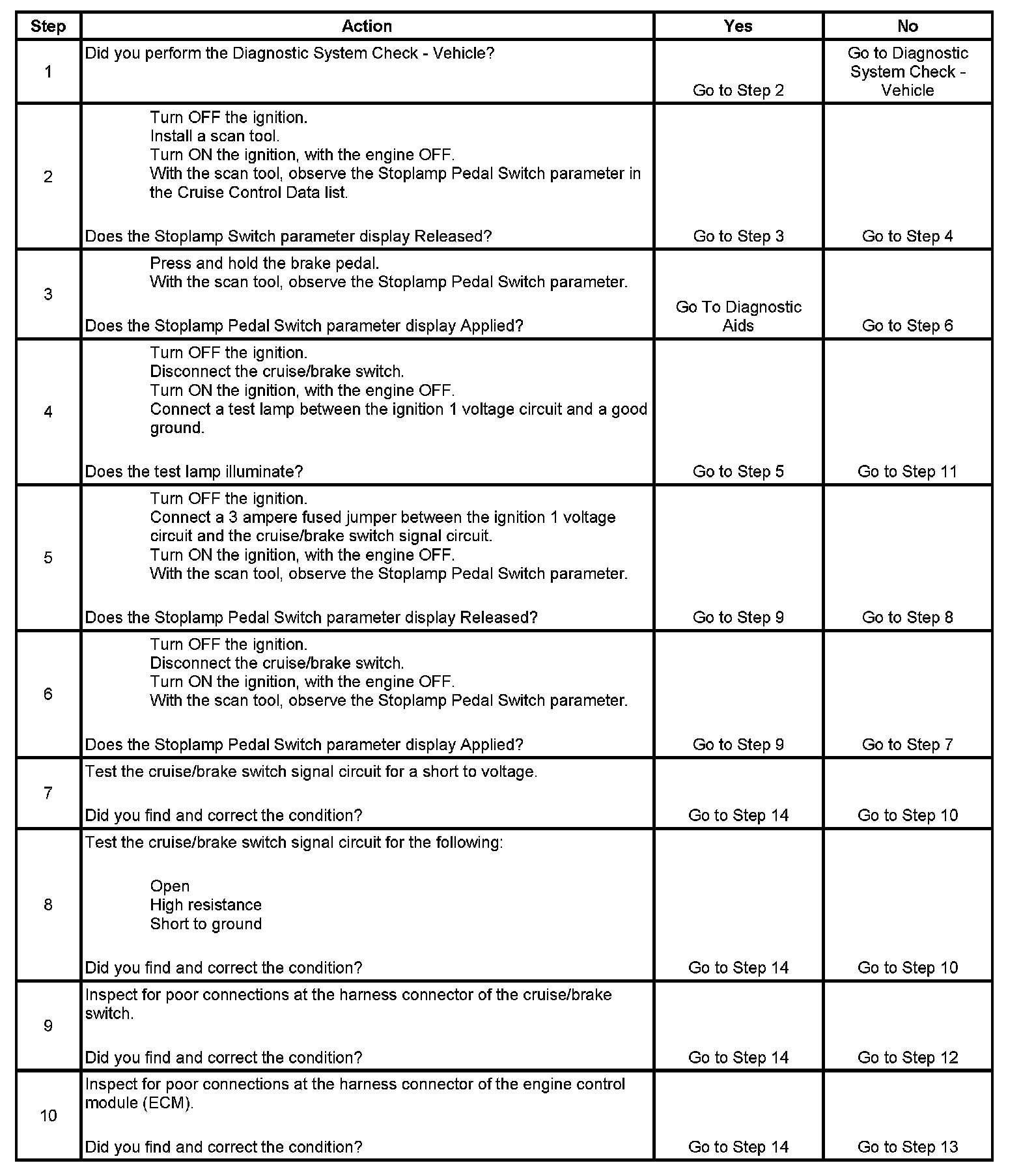 The cruise/brake switch is a normally closed switch and the stop lamp switch is a normally open switch. When the brake pedal is released, the engine control module (ECM) detects a high voltage signal on the cruise/brake switch signal circuit and a low signal voltage signal on the stop lamp switch signal circuit. When the brake pedal is applied, the cruise/brake switch opens and the stop lamp switch closes. The ECM detects a low voltage signal on the cruise brake switch signal circuit and a high voltage signal on the stop lamp switch signal circuit.