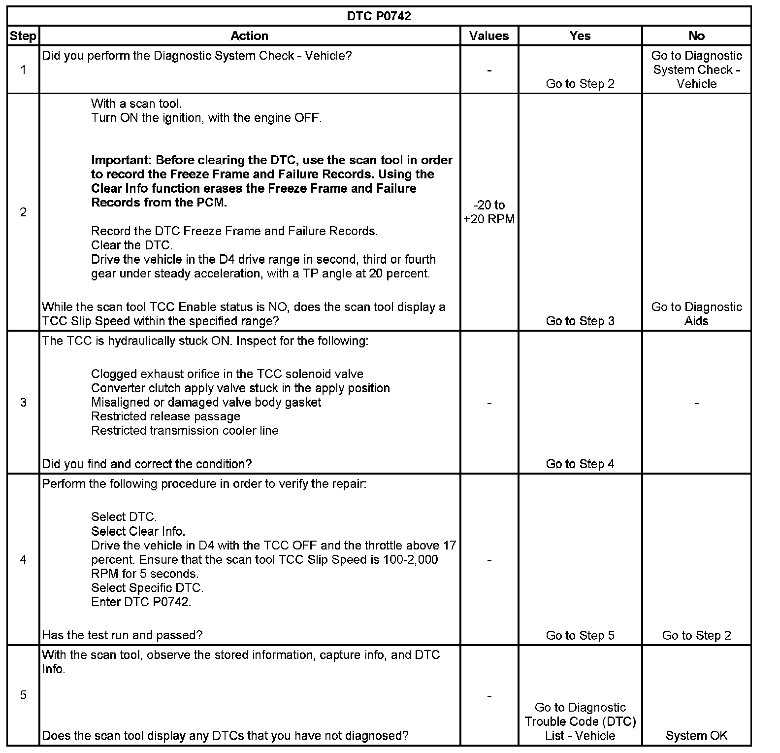 When the PCM detects low TCC slip speed when the TCC is commanded OFF, then DTC P0742 sets. DTC P0742 is a type B DTC.
