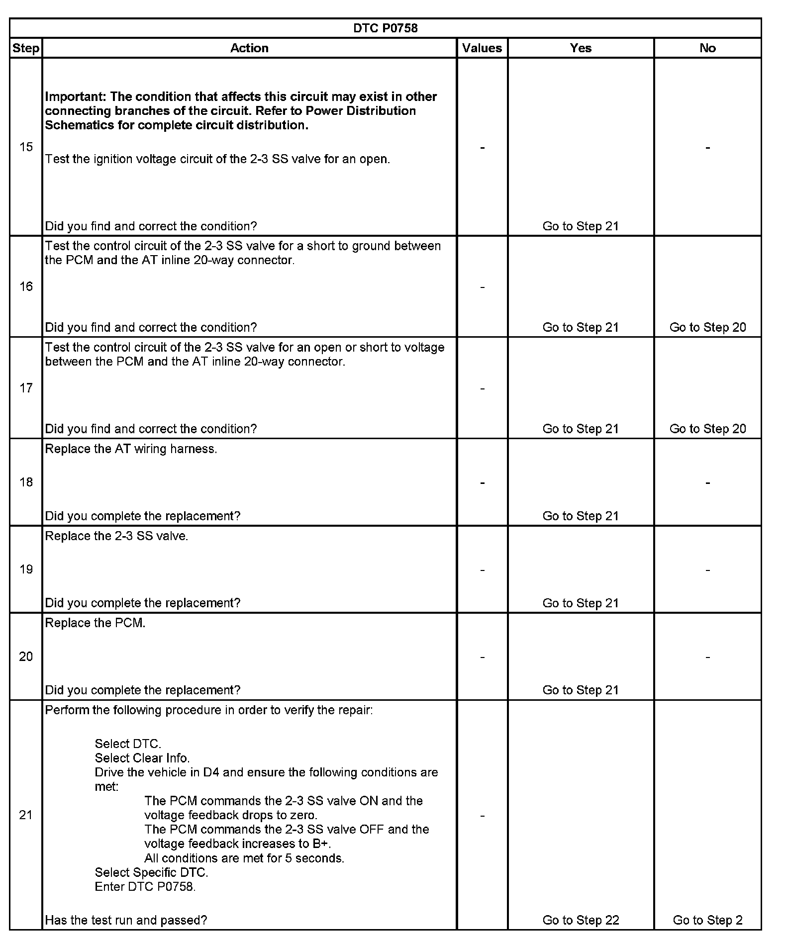 When the PCM detects a continuous open, short to ground or short to voltage in the 2-3 SS valve circuit, then DTC P0758 sets. DTC P0758 is a type A DTC.