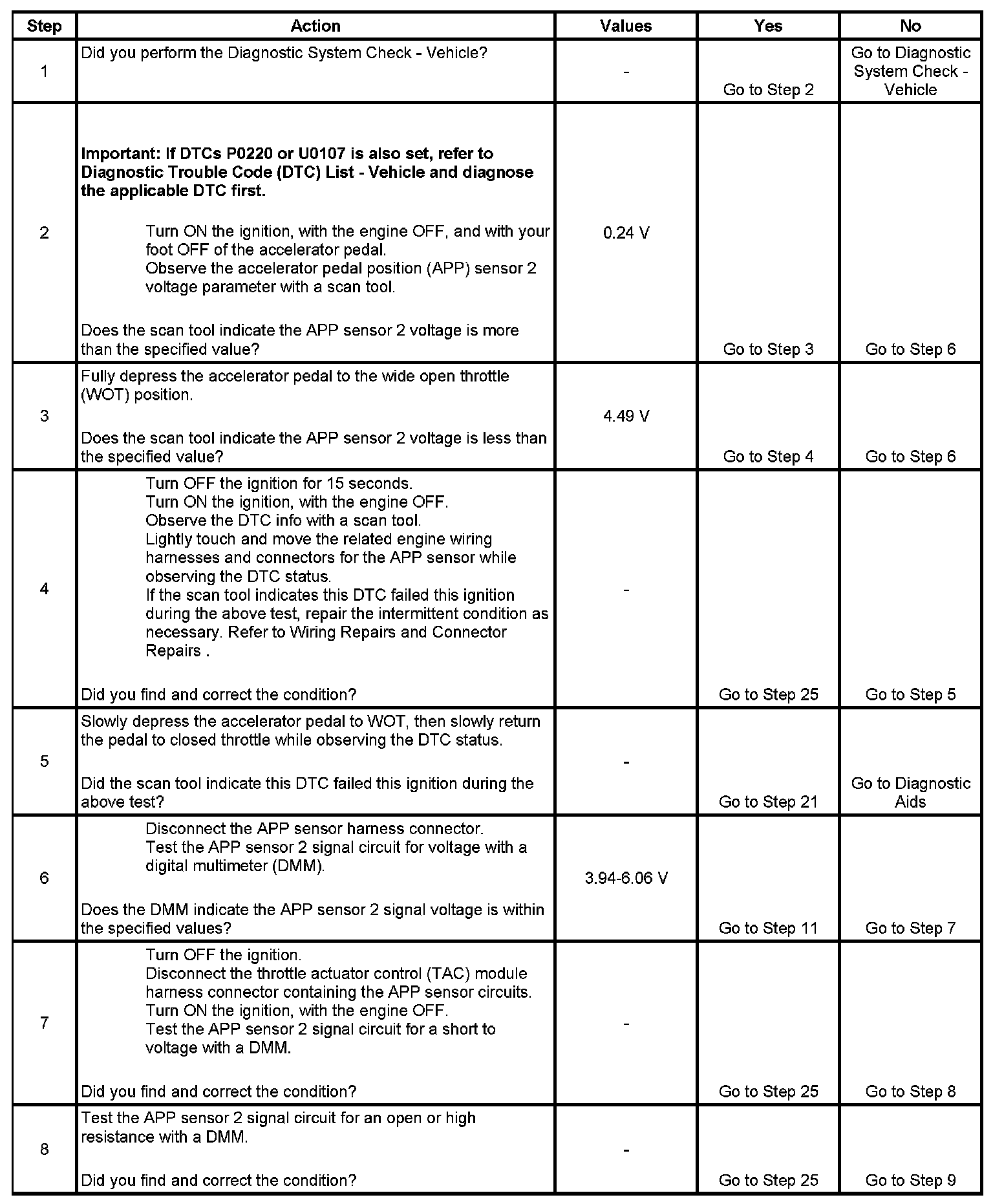 2. The throttle position (TP) sensor 2 and the APP sensor 2 share a common 5-volt reference source. Diagnose DTC P0220 first if that DTC is also set.