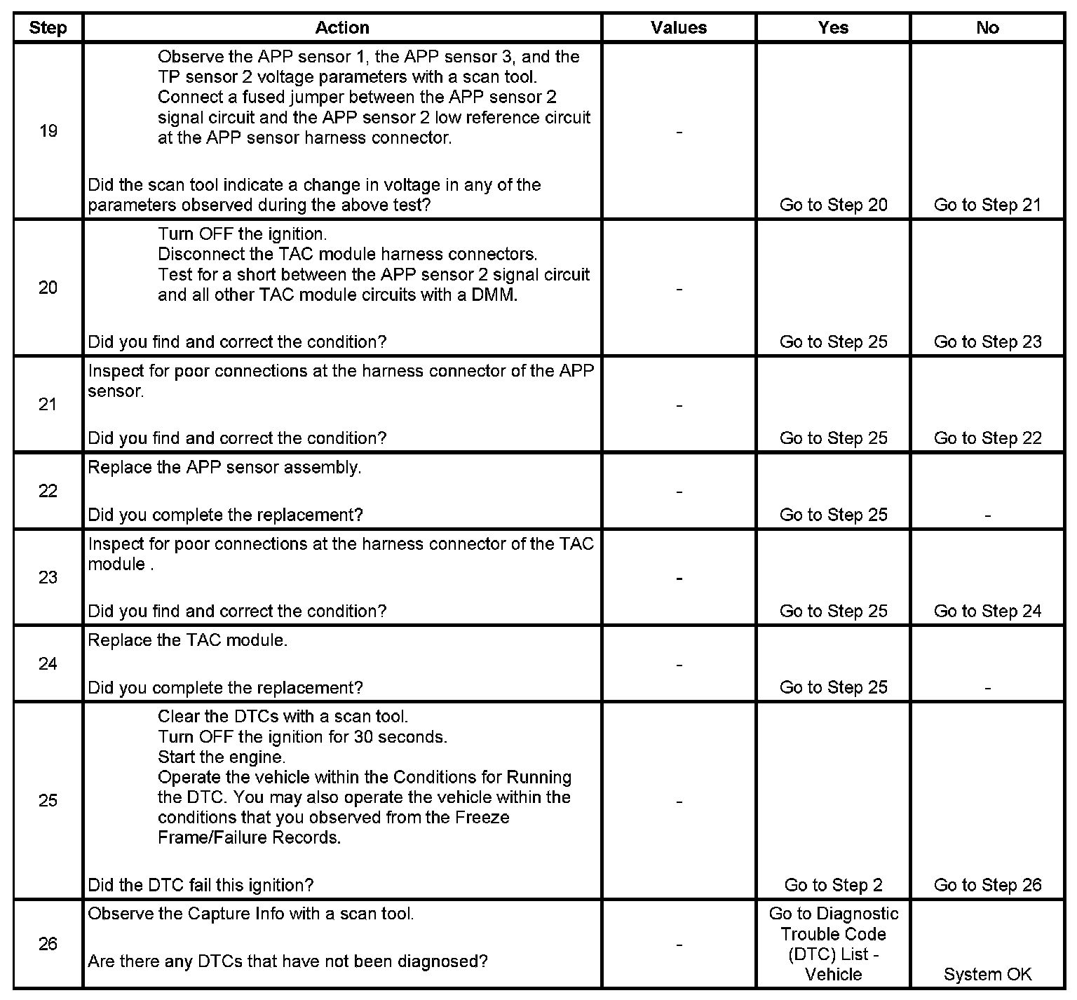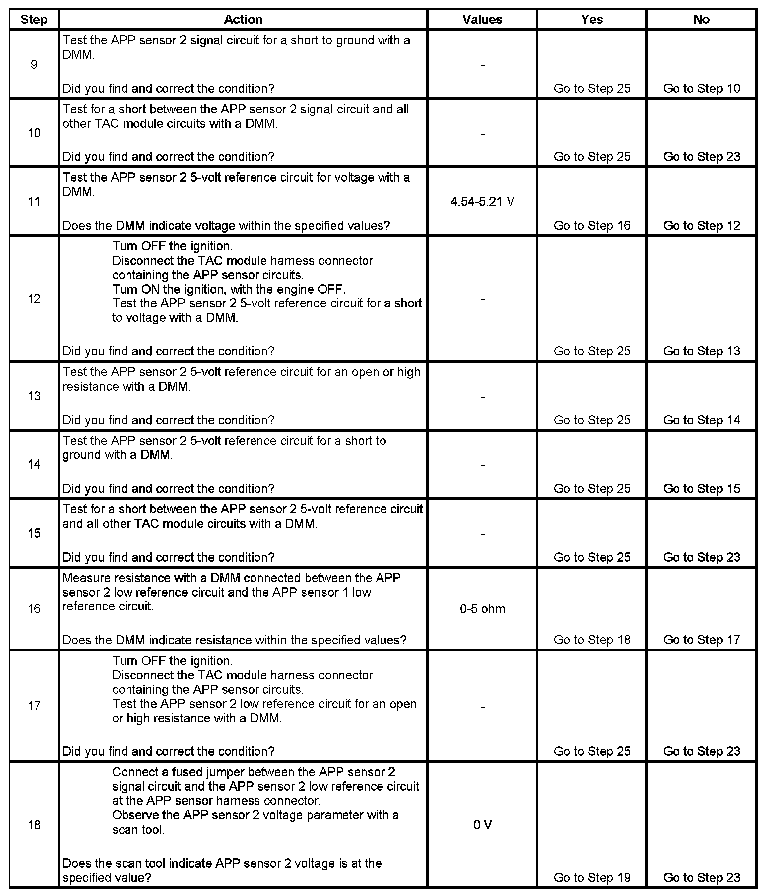 19. There are 2 separate 5-volt reference sources within the TAC module. The TP sensor 1 and the APP sensor 1 share one 5-volt reference source. The TP sensor 2 and the APP sensor 2 share another common 5-volt reference source. This test determines whether the signal circuit is shorted to any one of the 5-volt reference circuits. If a short exists, the corresponding sensor voltage will be pulled low.