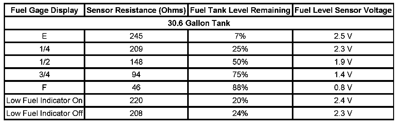 The information in this table is intended for use with the J 33431-C Signal Generator and Instrument Panel Tester. The fuel level sensor values represent the test values to be used on the Signal Generator to drive the fuel gage display to the indicated positions. Vehicles that require more than one fuel level sensor calculate gage position from many possible resistance combinations of fuel levels between the two tanks. Therefore, the values in the table may not correlate directly to readings taken from the vehicle primary or secondary sending units.