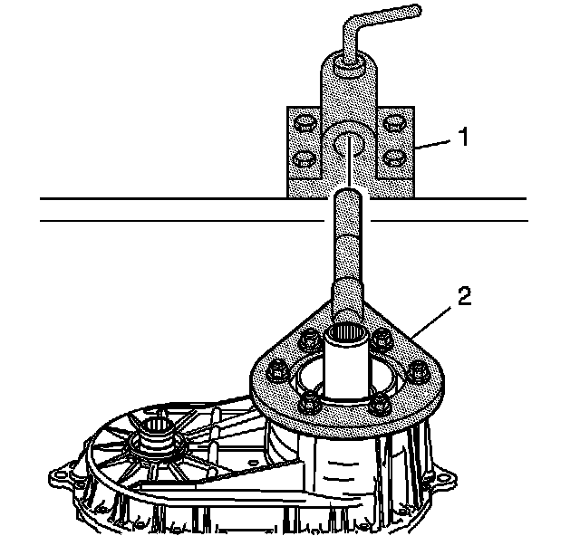 40. Remove the rear bearing for the front output shaft from the rear case, using the J 26941 (1) and the J 23907 (2).