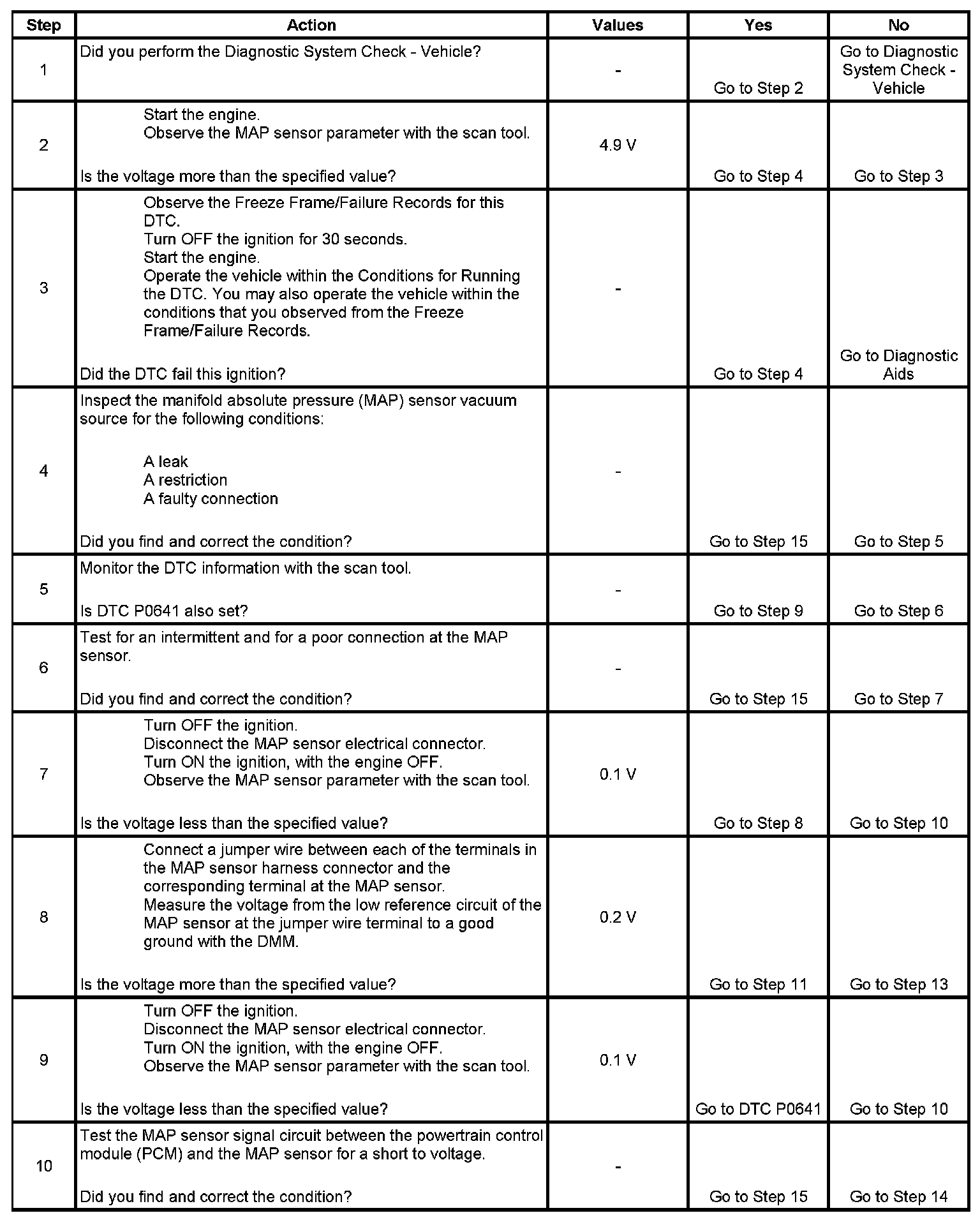 The powertrain control module (PCM) supplies 5 volts to the MAP sensor on the 5-volt reference circuit. The PCM also provides a ground on the low reference circuit. The MAP sensor provides a signal to the PCM on the MAP sensor signal circuit which is relative to the pressure changes in the manifold. The PCM should detect a low signal voltage at a low MAP, such as during an idle or a deceleration. The PCM should detect a high signal voltage at a high MAP, such as the ignition is ON, with the engine OFF, or at a wide open throttle (WOT). The MAP sensor is also used in order to determine the barometric pressure (BARO). This occurs when the ignition switch is turned ON, with the engine OFF. The BARO reading may also be updated whenever the engine is operated at WOT. The PCM monitors the MAP sensor signal for voltage outside of the normal range.