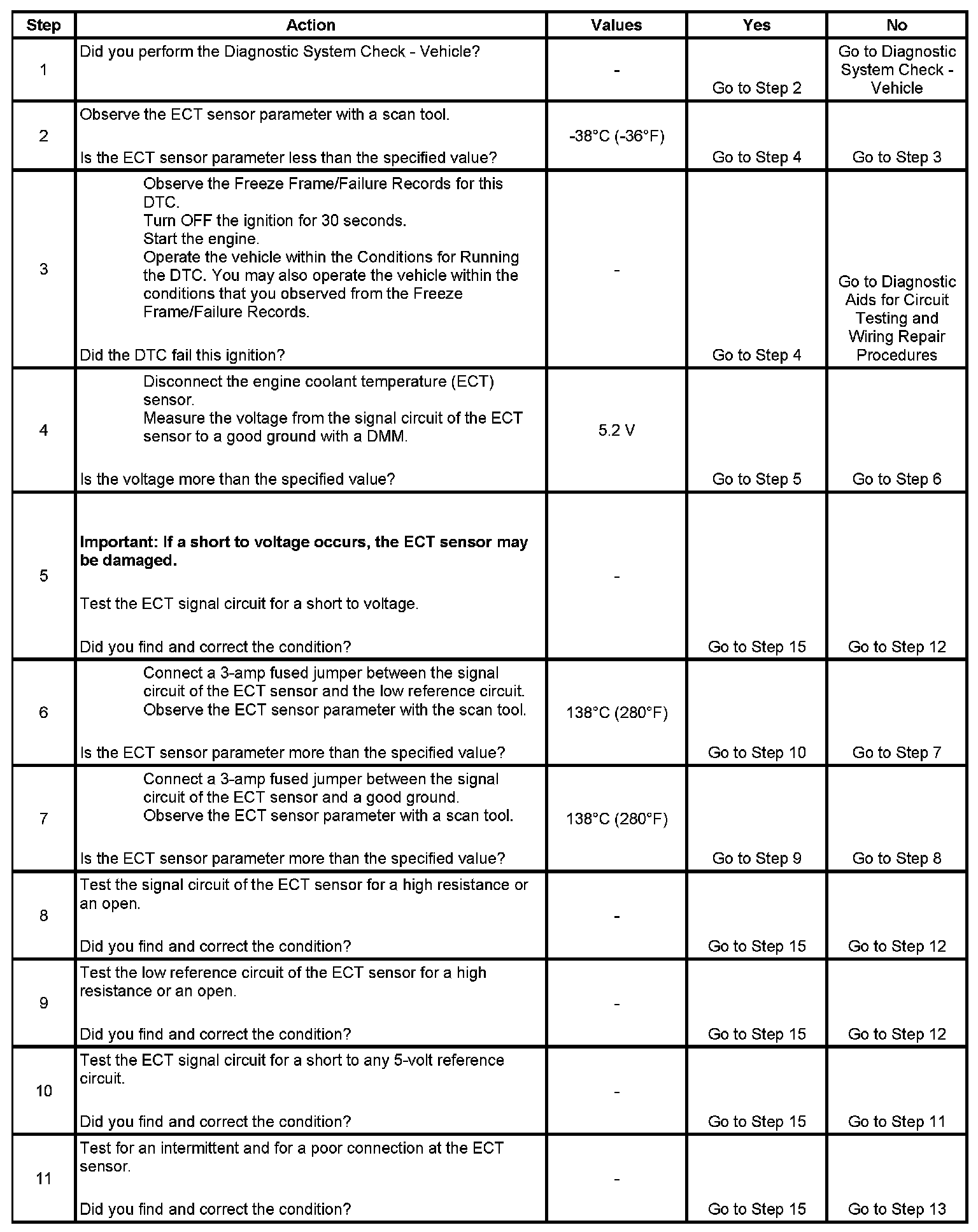 The engine coolant temperature (ECT) sensor is a variable resistor, that measures the temperature of the engine coolant. The ECT sensor has a signal circuit and a low reference circuit. The powertrain control module (PCM) supplies 5 volts to the ECT signal circuit and a ground for the ECT low reference circuit. When the ECT is cold, the sensor resistance is high. When the ECT increases, the sensor resistance decreases. With high sensor resistance, the PCM detects a high voltage on the ECT signal circuit. With lower sensor resistance, the PCM detects a lower voltage on the ECT signal circuit. If the PCM detects an excessively high ECT signal voltage, which is a low temperature indication, DTC P0118 sets.