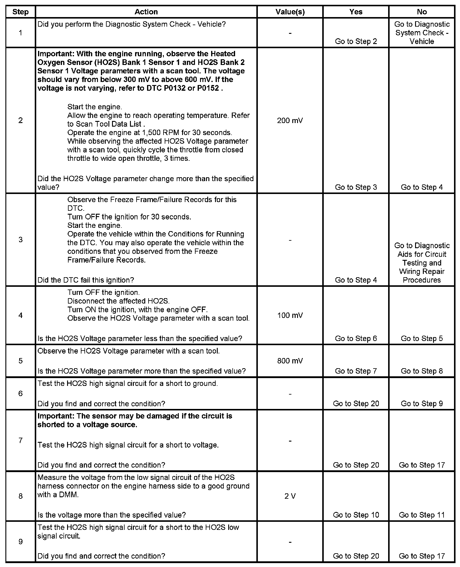 Heated oxygen sensors (HO2S) are used for fuel control and post catalyst monitoring. Each HO2S compares the oxygen content of the surrounding air with the oxygen content in the exhaust stream. The HO2S must reach operating temperature to provide an accurate voltage signal. Heating elements inside the HO2S minimize the time required for the sensors to reach operating temperature. The powertrain control module (PCM) supplies the HO2S with a reference, or bias, voltage of about 450 mV. When the engine is first started the PCM operates in Open Loop, ignoring the HO2S voltage signal. Once the HO2S reaches operating temperature and Closed Loop is achieved, the HO2S generates a voltage within a range of 0-1,000 mV that fluctuates above and below bias voltage. High HO2S voltage indicates a rich exhaust stream. Low HO2S voltage indicates a lean exhaust stream. If the PCM detects an HO2S voltage that stays below a specified value, DTC P0137 sets for HO2S bank 1 sensor 2, or DTC P0157 sets for HO2S bank 2 sensor 2.