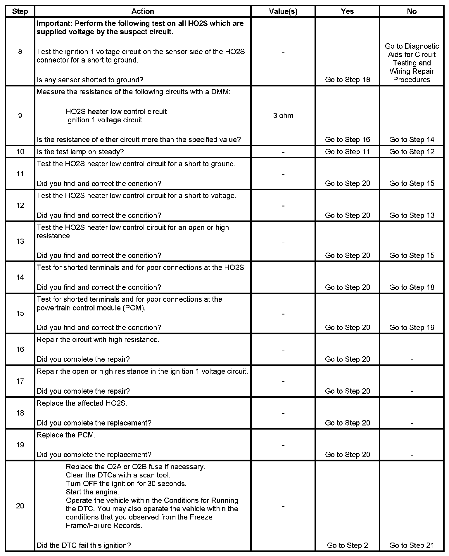 The heated oxygen sensor (HO2S) must reach operating temperature to provide an accurate voltage signal. A heating element inside the HO2S minimizes the time required for the sensor to reach operating temperature. Voltage is provided to the heater by the ignition 1 voltage circuit through a fuse. With the engine running, ground is provided to the heater by the HO2S heater low control circuit, through a low side driver within the powertrain control module (PCM). The PCM commands the heater ON or OFF to maintain a specific HO2S operating temperature range. The PCM determines the temperature by measuring the current flow through the heater. When the heater is in the ON state, the PCM will pulse the heater OFF for a duration of 50 ms, once per second. When the heater is in the OFF state, the PCM will pulse the heater ON for a duration of 50 ms, once per second. The PCM monitors the heater current with the engine running. This diagnostic will only run once per ignition cycle. If the PCM detects that the heater current is not within an expected range, the following DTCs will set: