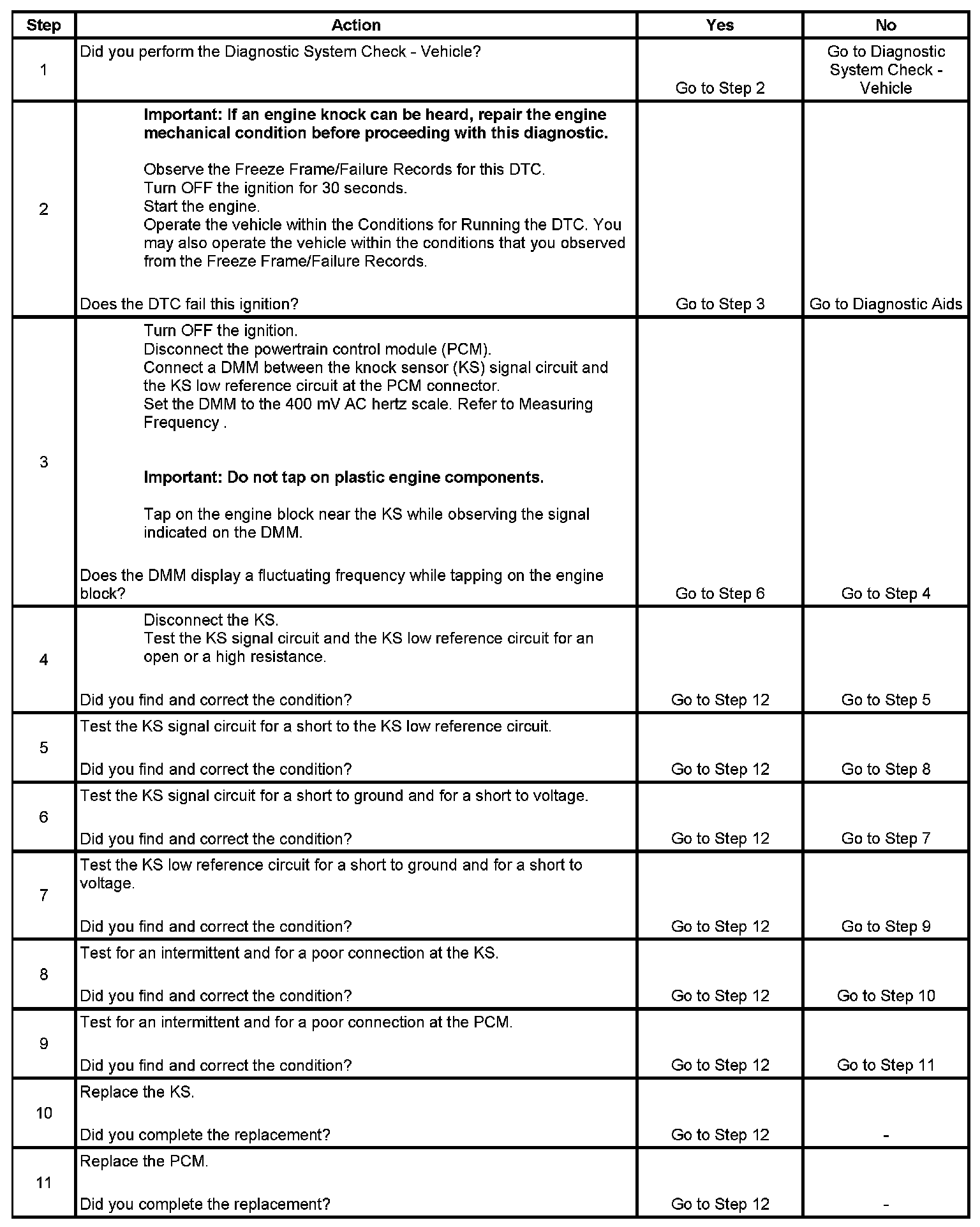 The powertrain control module (PCM) monitors a knock sensor (KS) to determine if detonation is present. The KS produces an AC voltage at all engine speeds and loads. The PCM then adjusts the spark timing based on the amplitude and frequency of the KS signal. The PCM uses the KS signal to calculate the average voltage and then assigns a voltage range value. The PCM should monitor the KS signal within the assigned voltage range. This DTC will set if the KS signal is outside the assigned voltage range or the KS signal is not present.