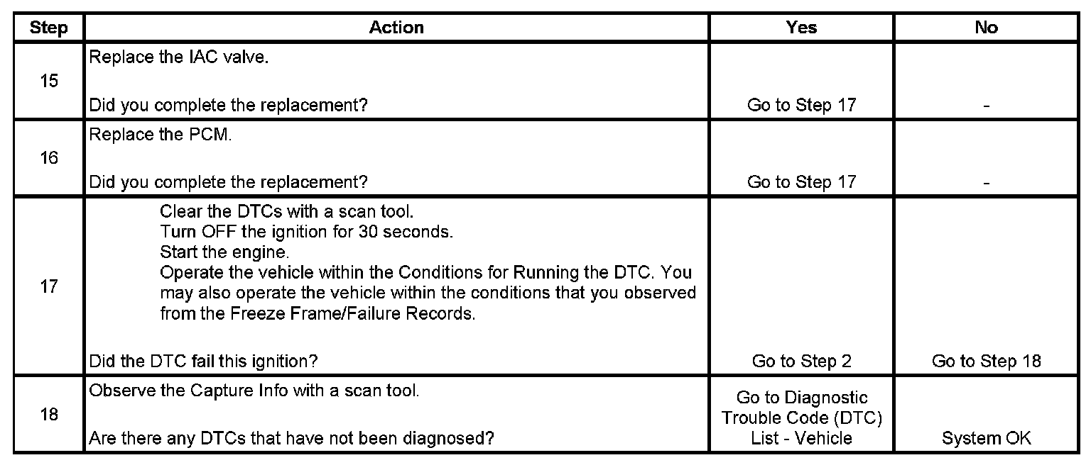 The engine idle speed is controlled by the idle air control (IAC) valve. The IAC valve is on the throttle body. The IAC valve pintle moves in and out of an idle air passage bore to control air flow around the throttle plate. The IAC valve consists of a movable pintle, driven by a gear attached to an electric motor called a stepper motor. The stepper motor is capable of highly accurate rotation, or of movement, called steps. The stepper motor has 2 separate windings that are called coils. Each coil is supplied current by 2 circuits from the powertrain control module (PCM). When the PCM changes polarity of a coil, the stepper motor moves one step. The PCM uses a predetermined number of counts to determine the IAC pintle position. Observe IAC counts with a scan tool. The IAC counts will increment up or down as the PCM attempts to change the IAC valve pintle position. An IAC Reset will occur when the ignition key is turned OFF. First, the PCM will seat the IAC pintle in the idle air passage bore. Second, the PCM will retract the pintle a predetermined number of counts to allow for efficient engine start-up. If the engine idle speed is out of range for a calibrated period of time, an idle speed diagnostic trouble code (DTC) sets.