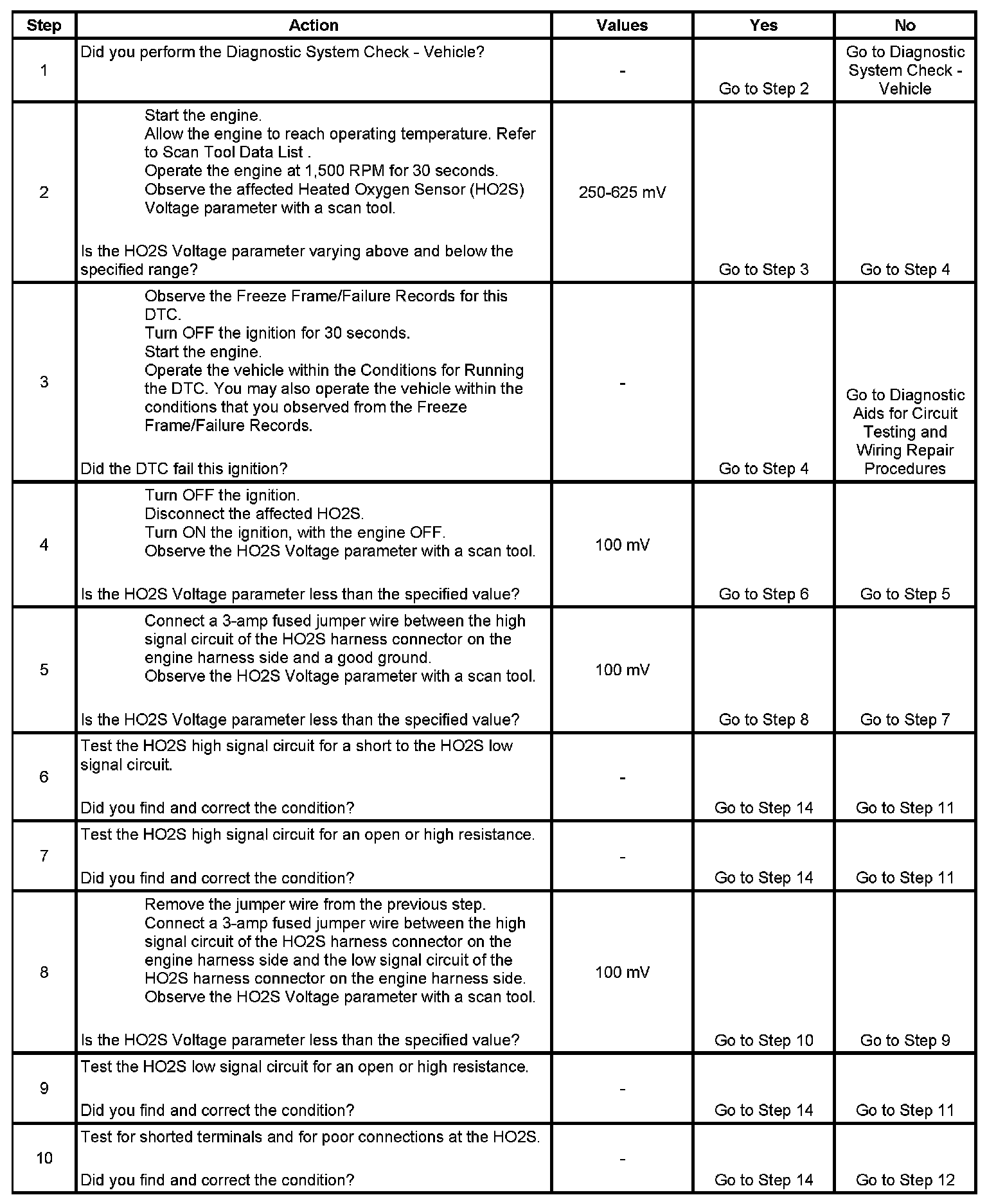 Heated oxygen sensors (HO2S) are used for fuel control and post catalyst monitoring. Each HO2S compares the oxygen content of the surrounding air with the oxygen content in the exhaust stream. The HO2S must reach operating temperature to provide an accurate voltage signal. Heating elements inside the HO2S minimize the time required for the sensors to reach operating temperature. The powertrain control module (PCM) supplies the HO2S with a reference, or bias, voltage of about 450 mV. When the engine is first started the PCM operates in Open Loop, ignoring the HO2S voltage signal. Once the HO2S reaches operating temperature and Closed Loop is achieved, the HO2S generates a voltage within a range of 0-1,000 mV that fluctuates above and below bias voltage. High HO2S voltage indicates a rich exhaust stream. Low HO2S voltage indicates a lean exhaust stream. This diagnostic will only run once per ignition cycle. The PCM monitors the number of rich-to-lean and lean-to-rich transitions. If the PCM detects that the number of transitions were less than a specified value, DTC P1133 sets for HO2S bank 1 sensor 1, or DTC P1153 sets for HO2S bank 2 sensor 1.