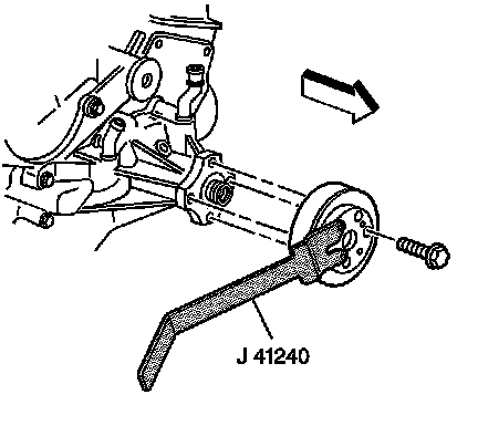 11. Using J 41240 to hold the water pump pulley, remove the water pump pulley bolts.