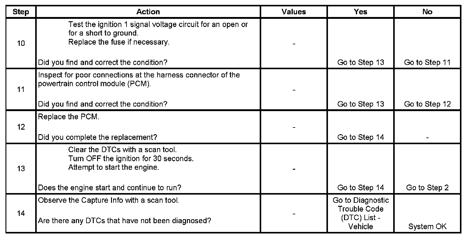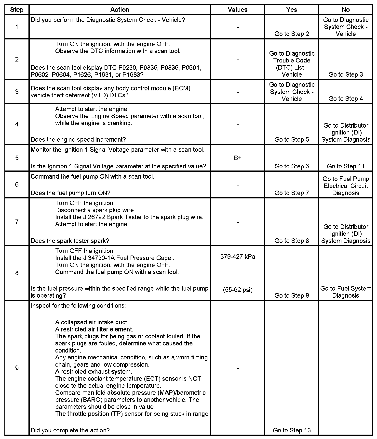 The Engine Cranks but Does Not Run diagnostic table is an organized approach to identifying a condition that prevents an engine from starting. The Engine Cranks but Does Not Run diagnostic table directs the service technician to the appropriate system diagnosis.