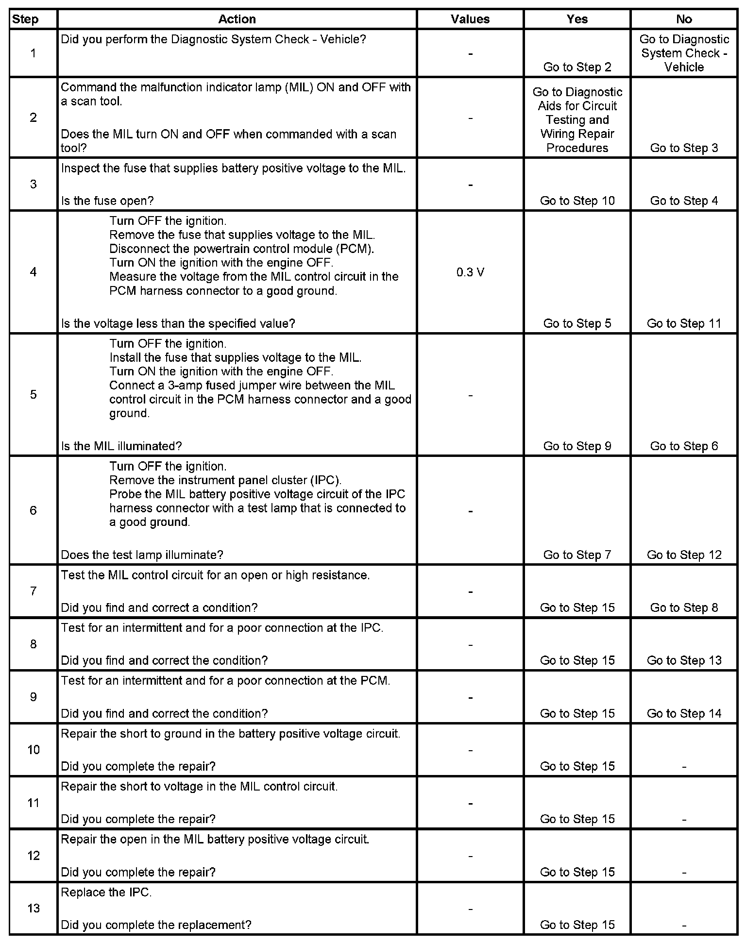Battery positive voltage is supplied directly to the malfunction indicator lamp (MIL). The powertrain control module (PCM) turns the MIL ON by grounding the MIL control circuit. There should be a steady MIL with the ignition ON and the engine OFF.