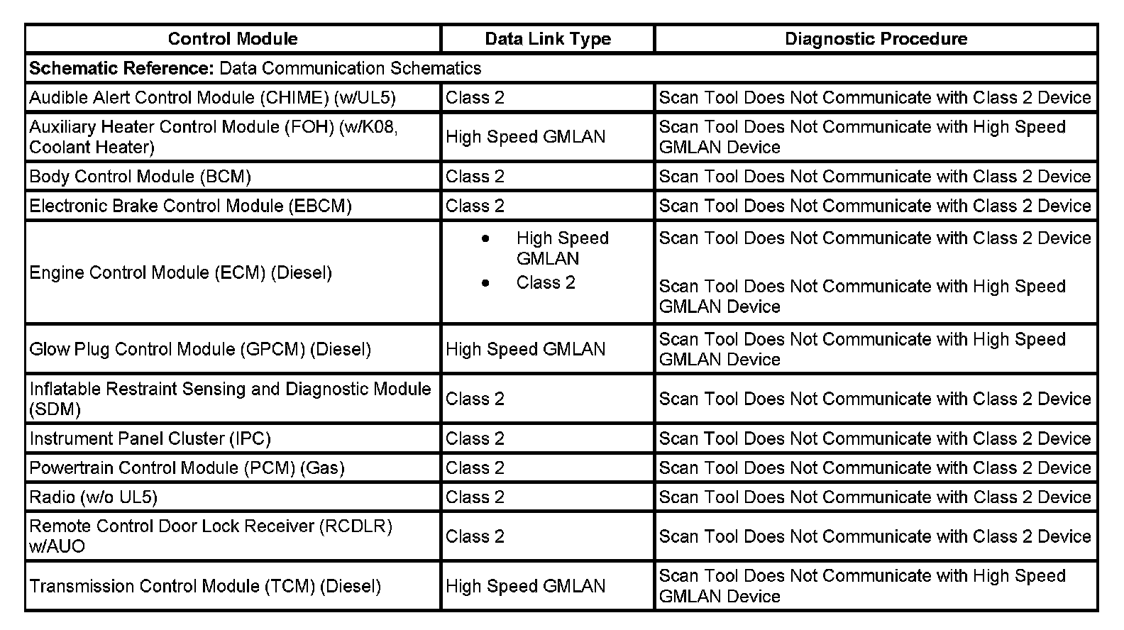 This table identifies which serial data link that a particular module uses for in-vehicle data transmission. Some modules may use more than one data link to communicate. This table is used to assist in correcting a communication malfunction between the control module and the scan tool. For the description and operation of these serial data communication circuits refer to Data Link Communications Description and Operation.