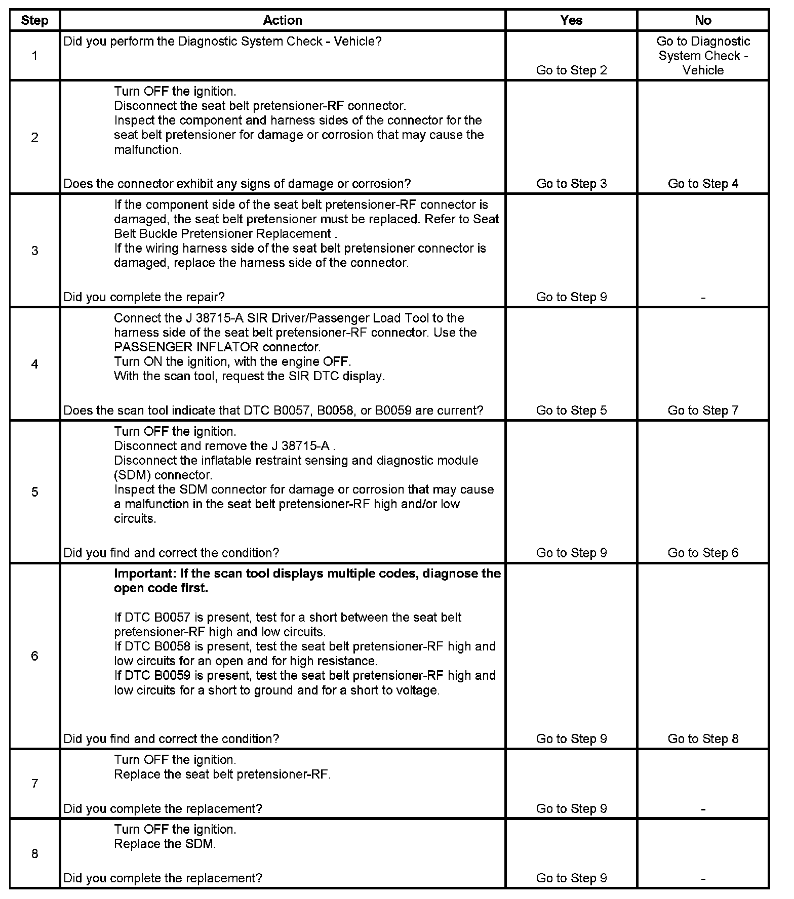 * DTC B0057 will set when the seat belt pretensioner-RF deployment loop resistance is less than 1.3 ohms for 500 milliseconds.