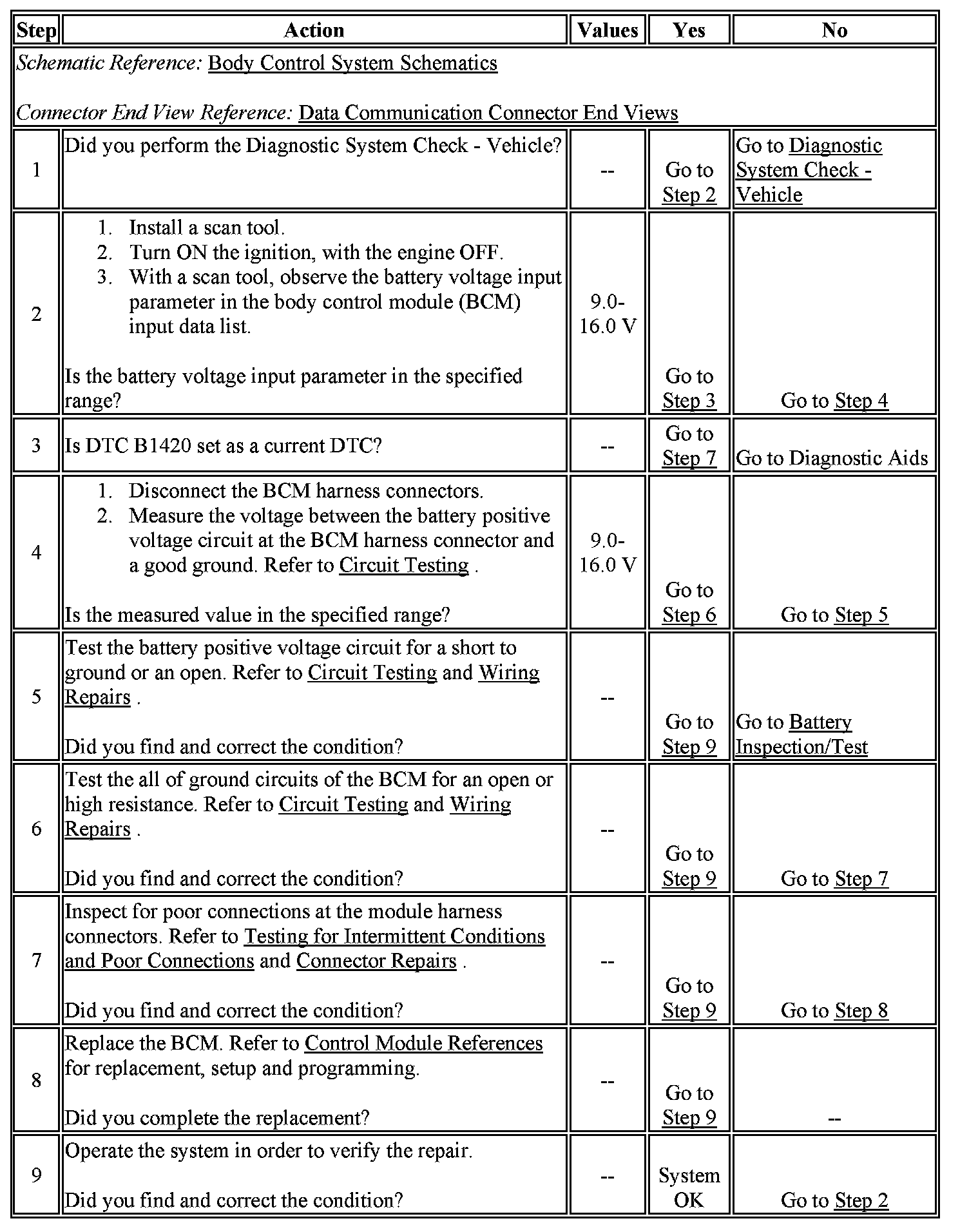 The body control module (BCM) monitors the battery voltage through the battery positive voltage circuit. If the BCM senses that battery voltage is outside of its normal range for 1 second, DTC B1420 will set.