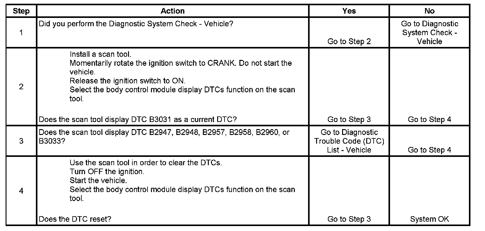 3. This step tests for the proper operation of the 12-volt reference security sensor power circuit, sensor ground circuit, and Passlock(TM) sensor signal data circuit. Troubleshoot the appropriate DTC prior to diagnosing DTC B3031.