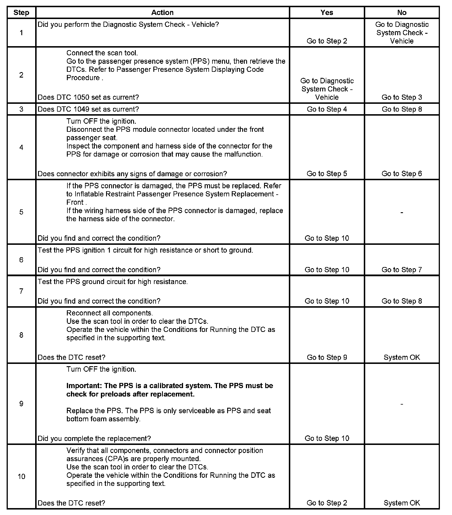 The inflatable restraint passenger presence system (PPS) is used to monitor the pressure profile of any occupant that is sitting in the front outboard passenger seat and communicate the profile classification to the sensing and diagnostic module (SDM). The SDM will either enable or suppress the deployment of the instrument panel (I/P) module based on the profile classification of the occupant. If the PPS detects that the vehicle voltage is too low or high the PPS will then set a DTC within the PPS, then the PPS will communicate to the SDM through a non class 2 communications circuit that a PPS fault is present. The SDM will then set DTC B0092 indicating a problem within the PPS.