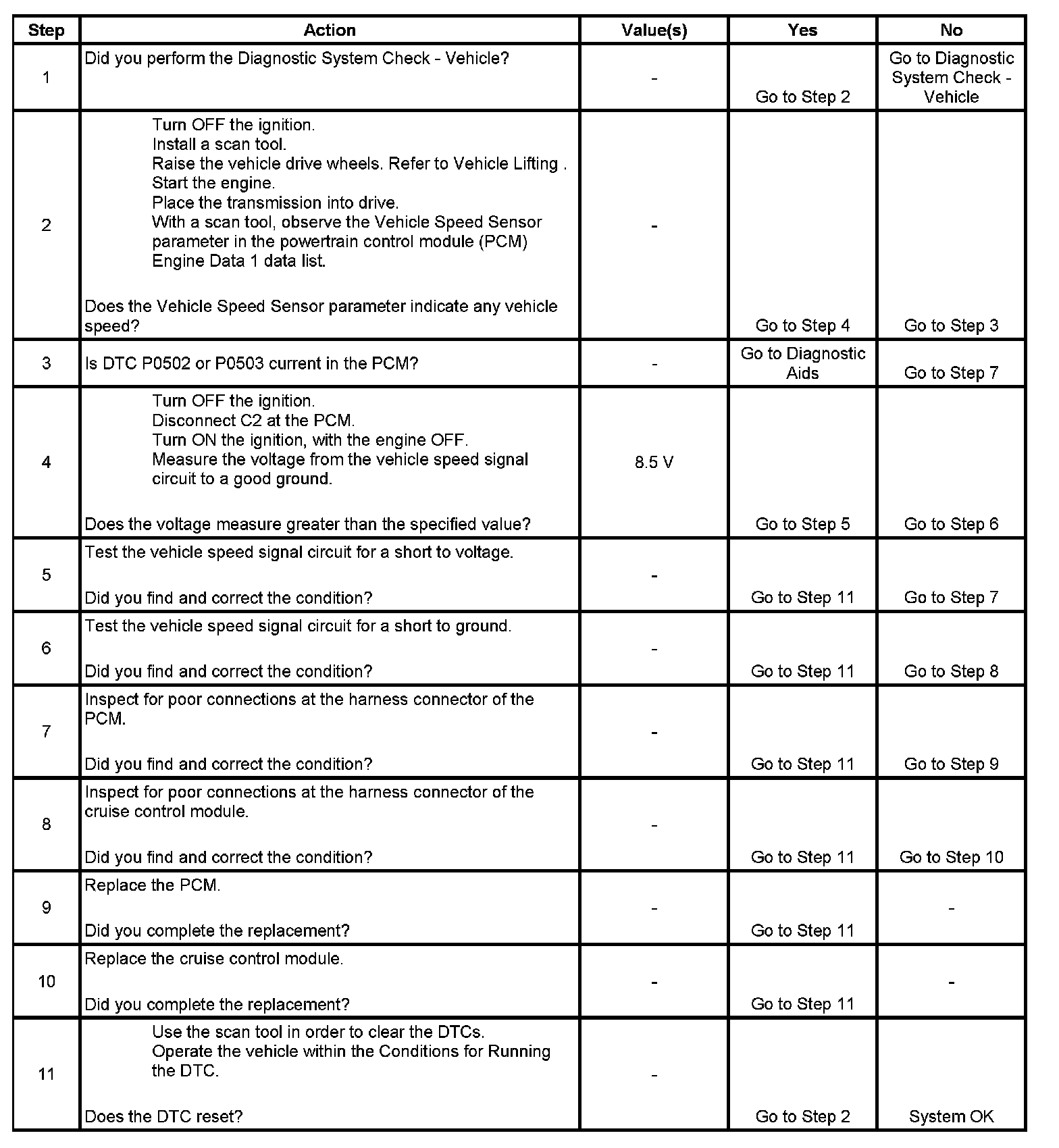The powertrain control module (PCM) creates the vehicle speed signal by pulsing the signal circuit to ground. The PCM pulses the circuit at the same rate as the vehicle speed signal input. The PCM monitors the voltage on the vehicle speed signal circuit. If the PCM determines the voltage is out of the normal operating range, a DTC sets.