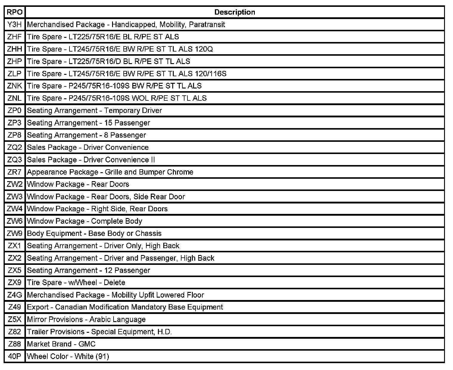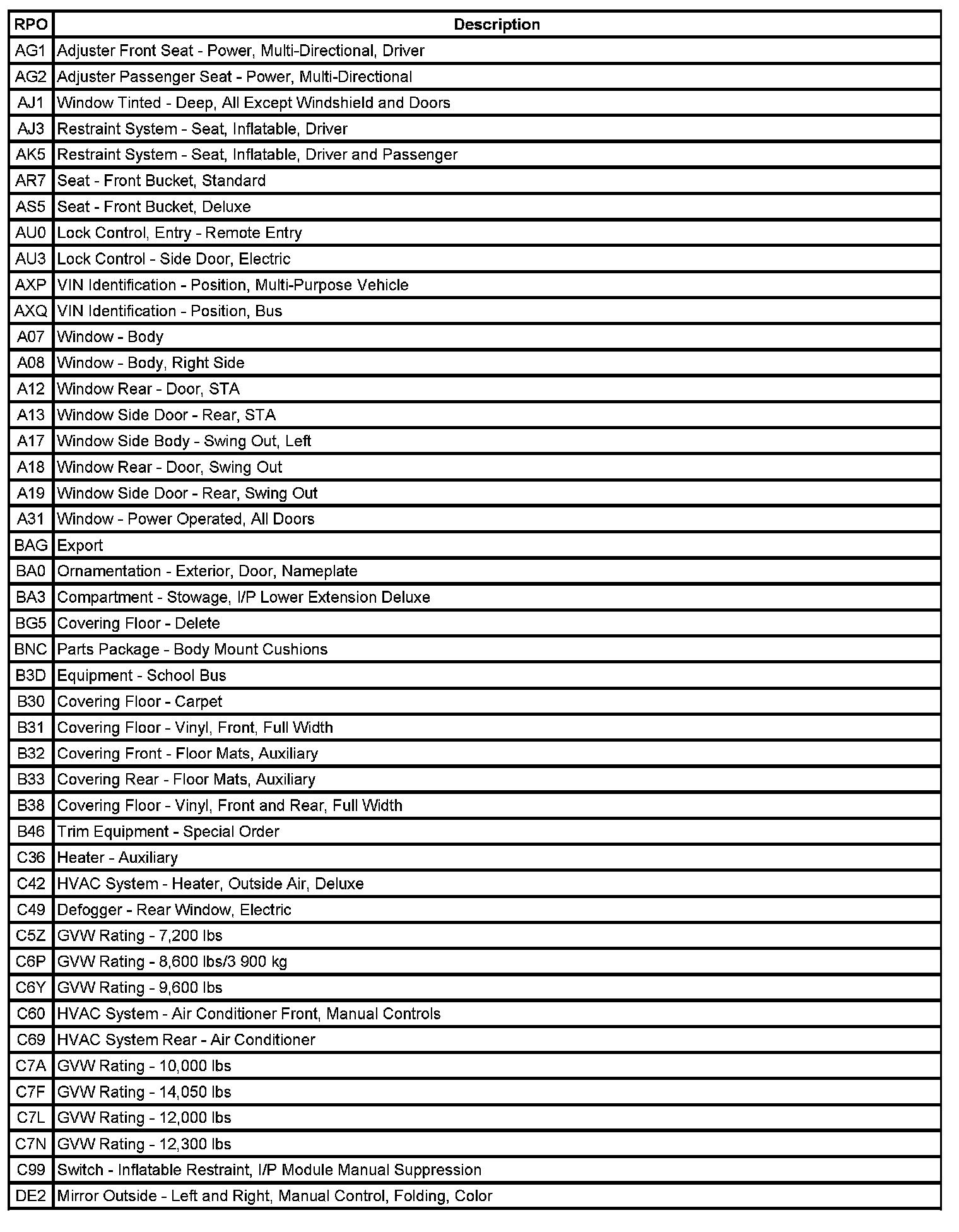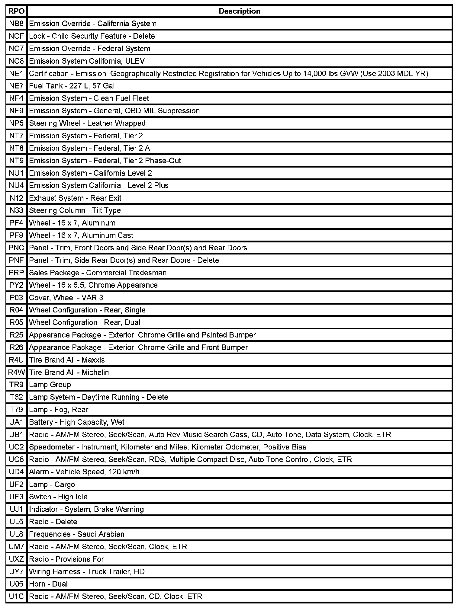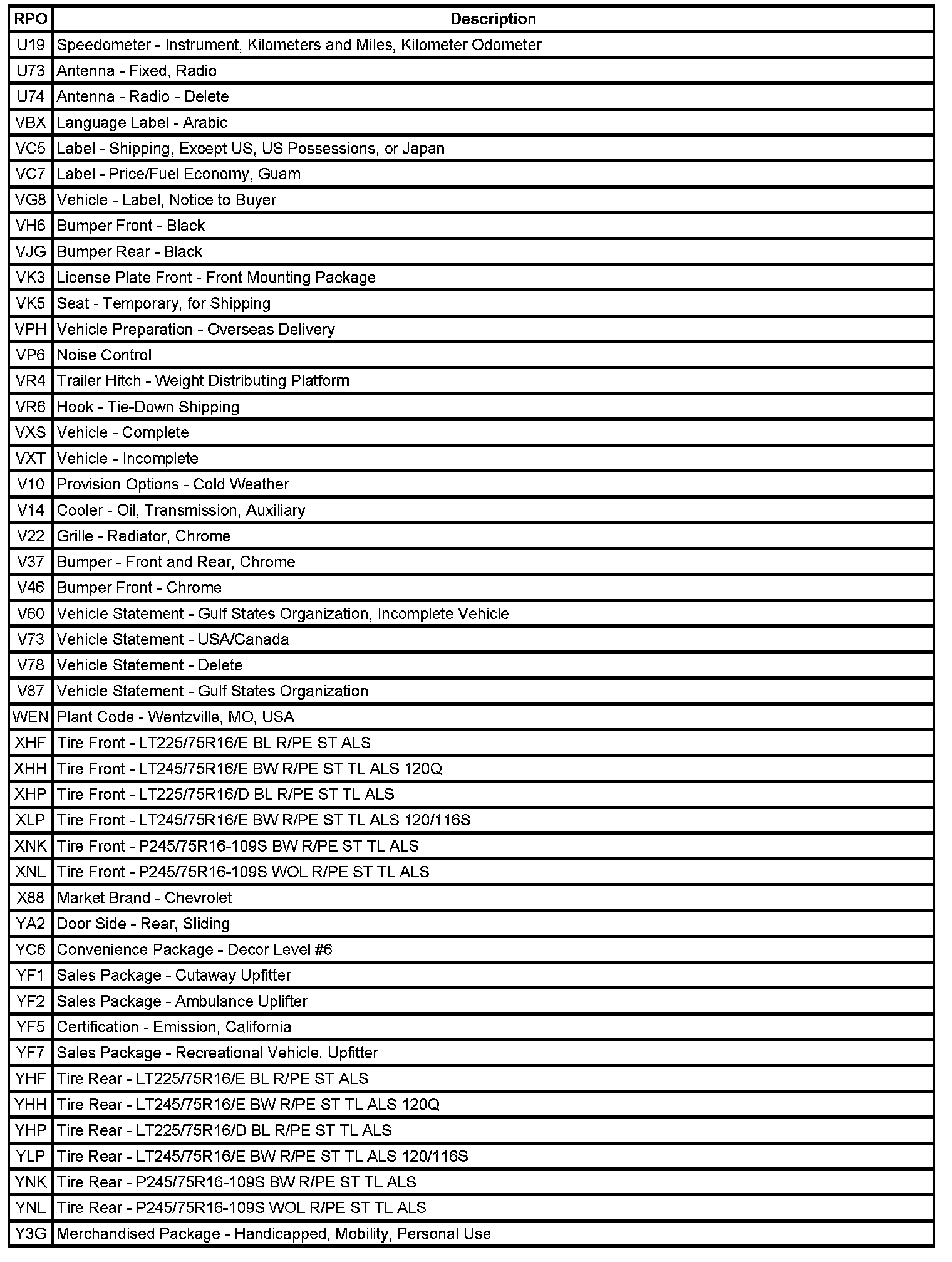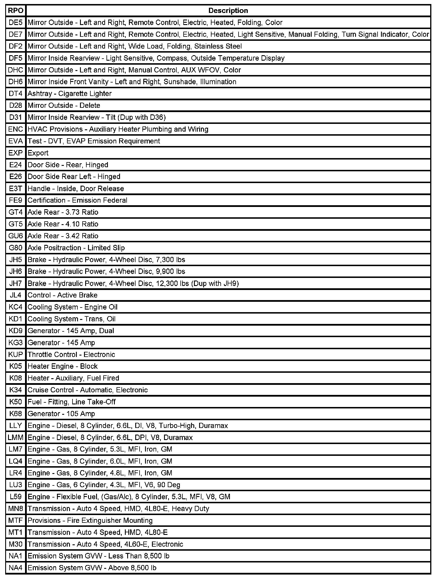 RPO Code List