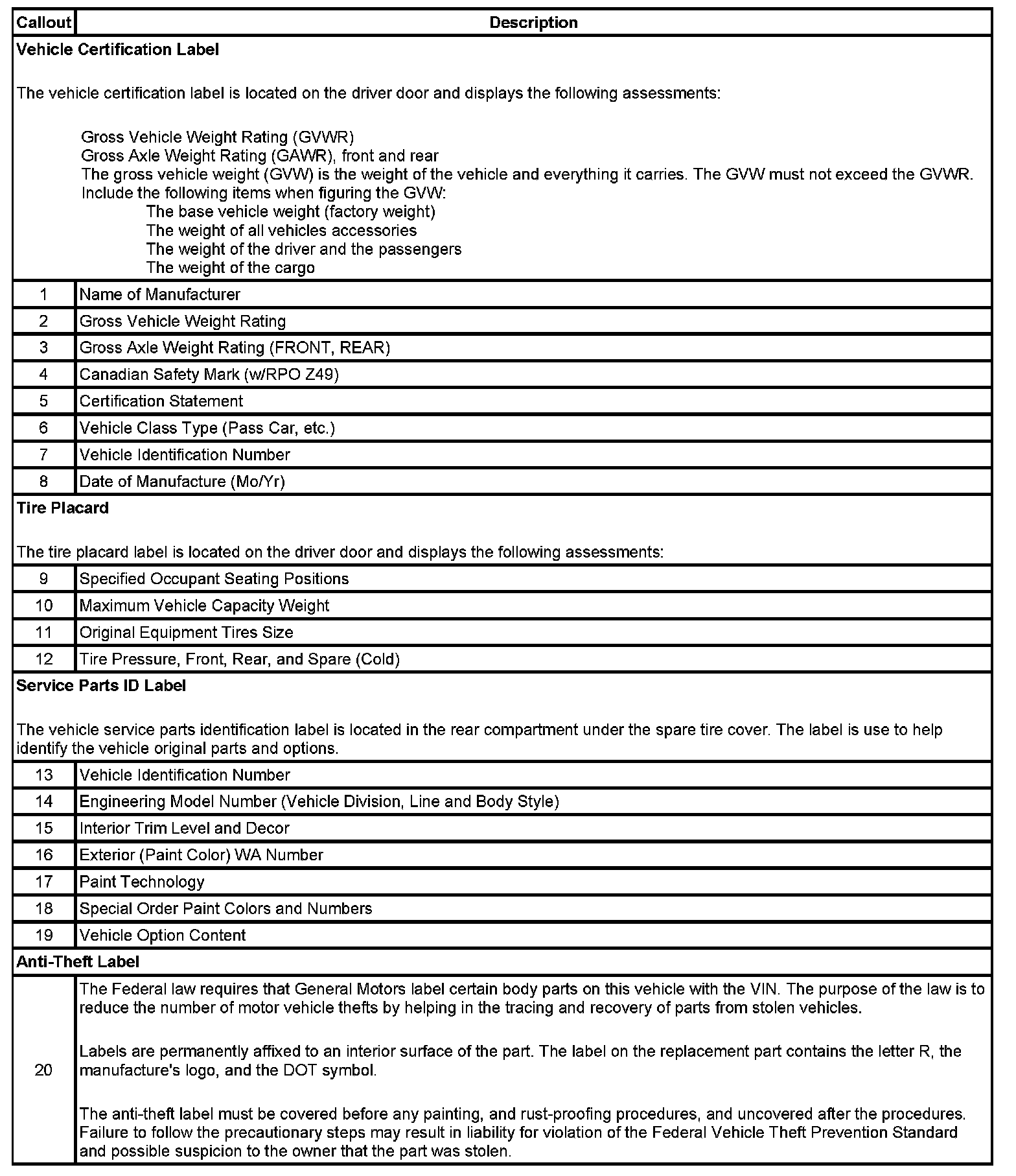 Vehicle Certification, Tire Placard, Anti-Theft, and Service Parts ID Label