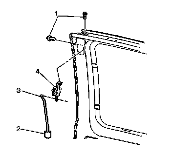 Install the bolts (1) in order to retain the left side rear door upper latch (2) to the door.