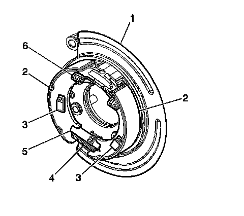 4. Install the park brake shoe hold down springs (3) by compressing the spring and rotating the springs 1/4 turn.