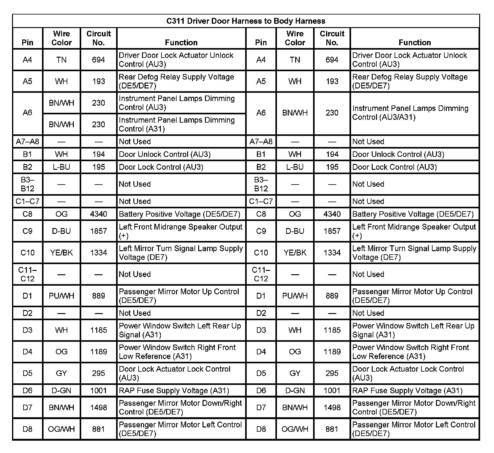 C311 Driver Door Harness To Body Harness (Pin A4 To D8):