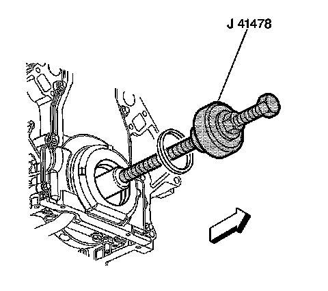3. Install the J 41478 threaded rod, with nut, washer, guide, and oil seal, into the end of the crankshaft.