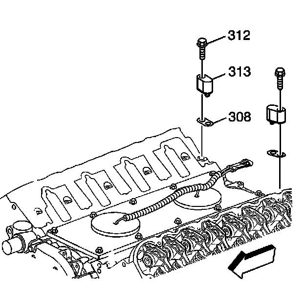 3. Install the covers (313), seals (308), and bolts (312) onto the rear of the engine.