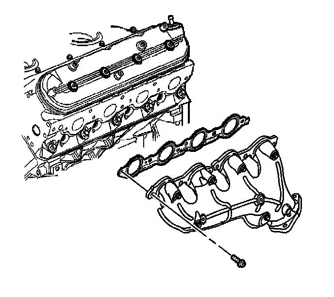 1. Tighten the exhaust manifold bolts a first pass to 15 N.m (11 lb ft). Tighten the exhaust manifold bolts beginning with the center 2 bolts. Alternate from side-to-side, and work toward the outside bolts.