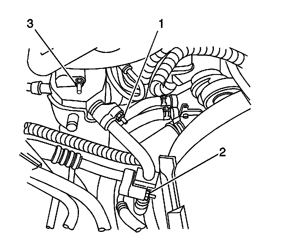 4. Remove the evaporator outlet hose retaining nut (3) from the accumulator.