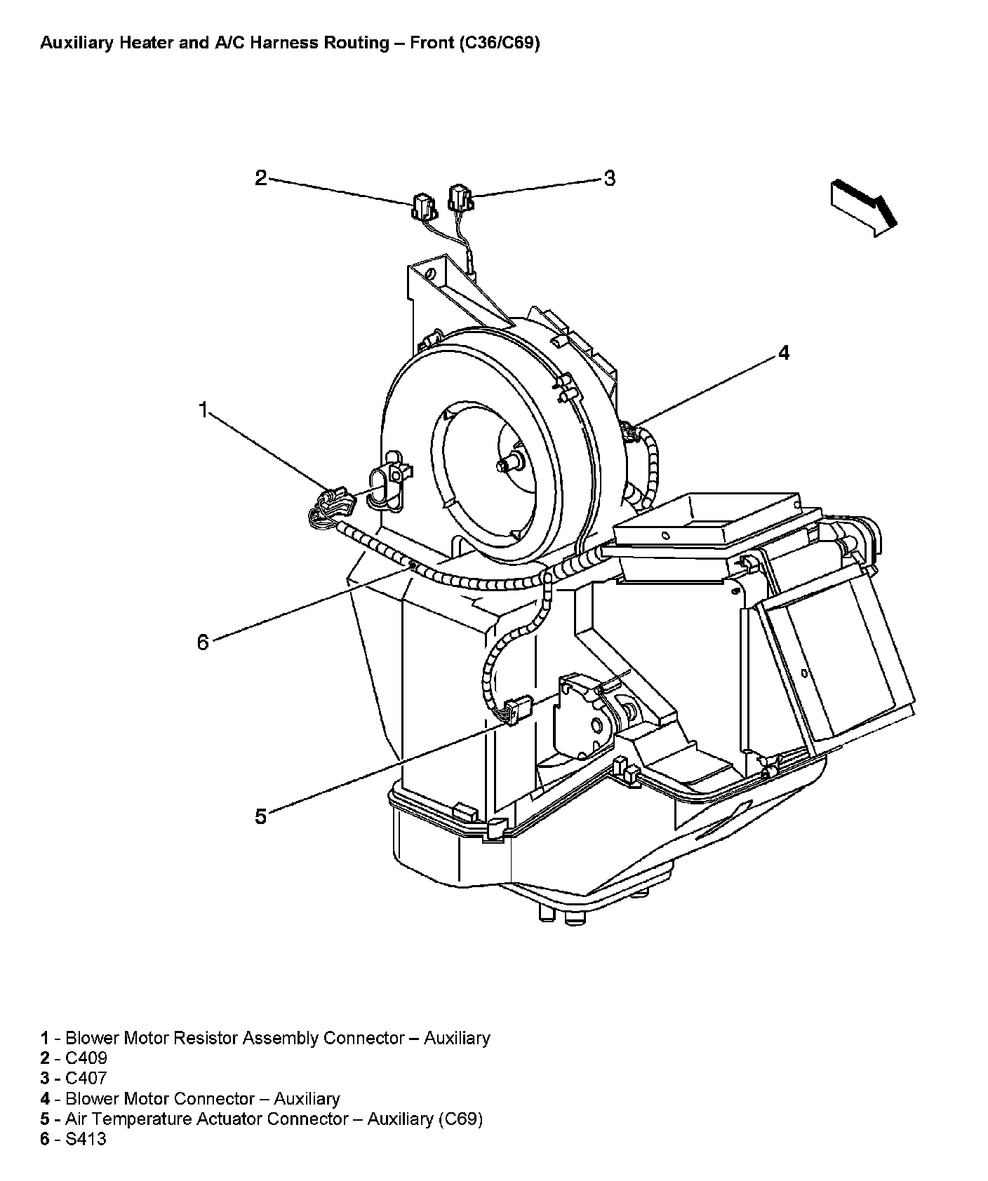Auxiliary Heater and A/C Harness Routing - Front (With RPO Code C36/C69)