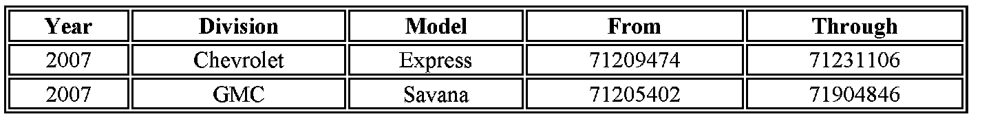 Involved are certain 2007 Chevrolet Express and GMC Savana vehicles built within the VIN breakpoints shown.