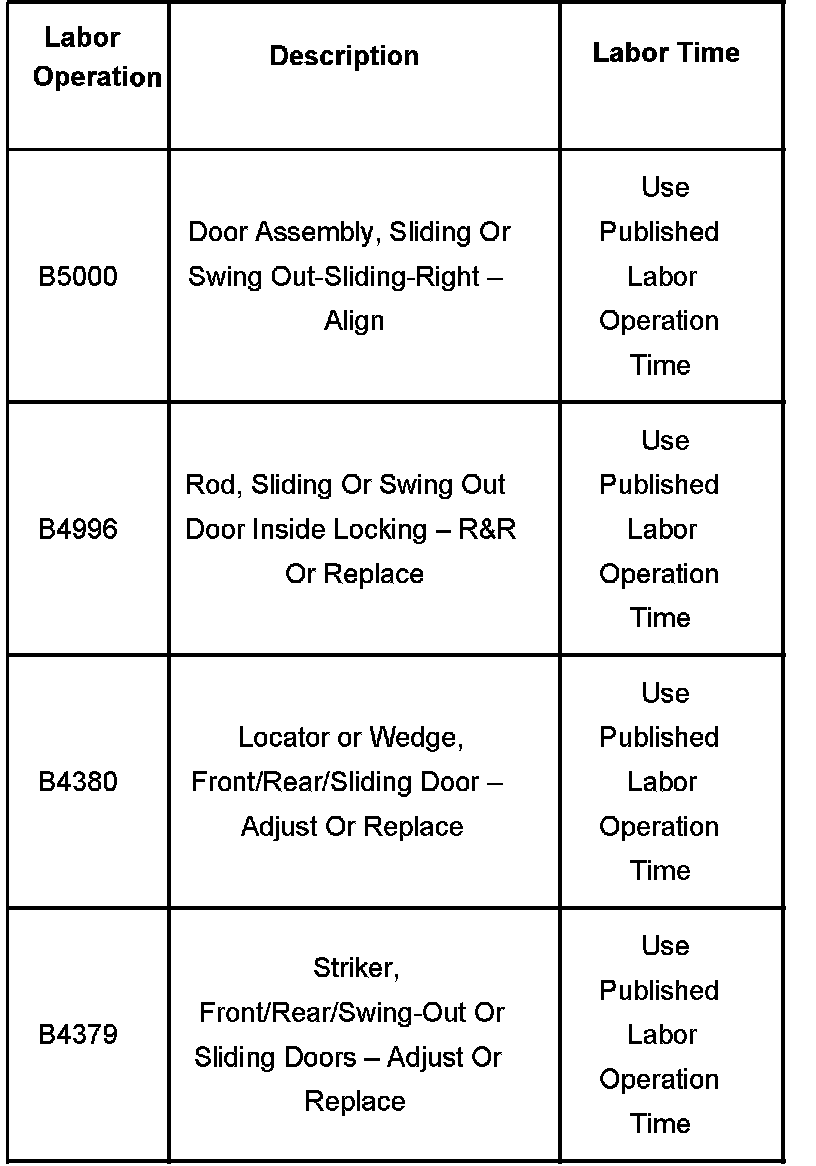 Adjust the door strikers, door wedge guide and rollers as needed. Refer to Sliding Rear Door Adjustment in SI.