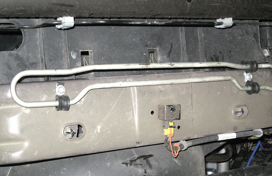 2. Remove the two bolts that secure the power steering cooler line to the front end lower tie bar.