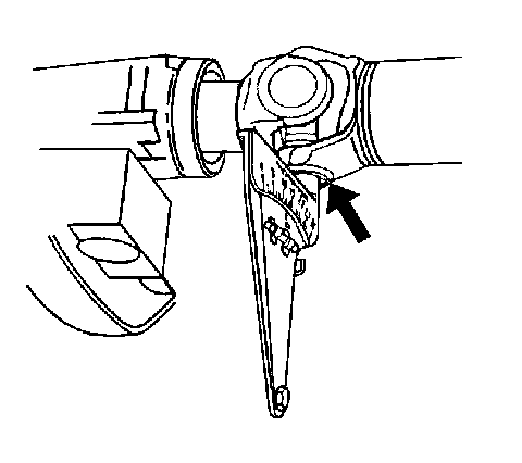 2. Install the J 23498-A, or equivalent to the lower U-joint bearing cap of the rear U-joint of the shaft. The J 23498-A, or equivalent should be aligned perpendicular to the propeller shaft.