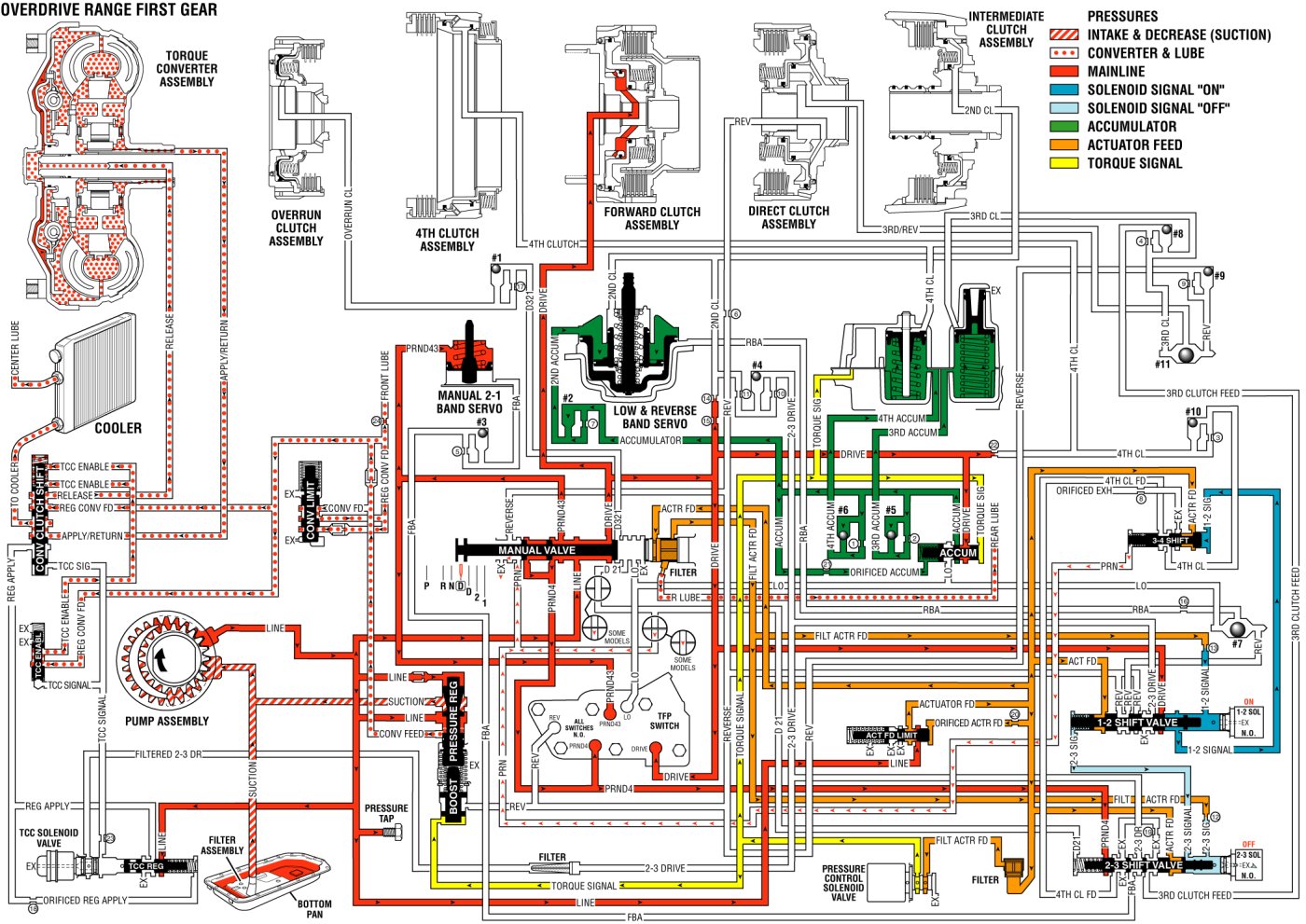 - In the Overdrive range first gear, line pressure from the pressure regulator valve is directed as PRND4, PRND43, and Drive fluid pressures. The PRND4 fluid pressure is directed to the Automatic Transmission Fluid Pressure (TFP) Manual Valve Position Switch Assembly and to the 2-3 shift valve. The PRND43 fluid is directed to the TFP manual valve position switch and to the manual 2-1 band servo. The Drive fluid is directed to the TFP manual valve position switch, the forward clutch, the 1-2 shift valve, and the accumulator valve.