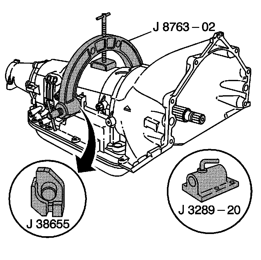 1. Install the J 8763-02 and the J 38655 onto the transmission assembly.